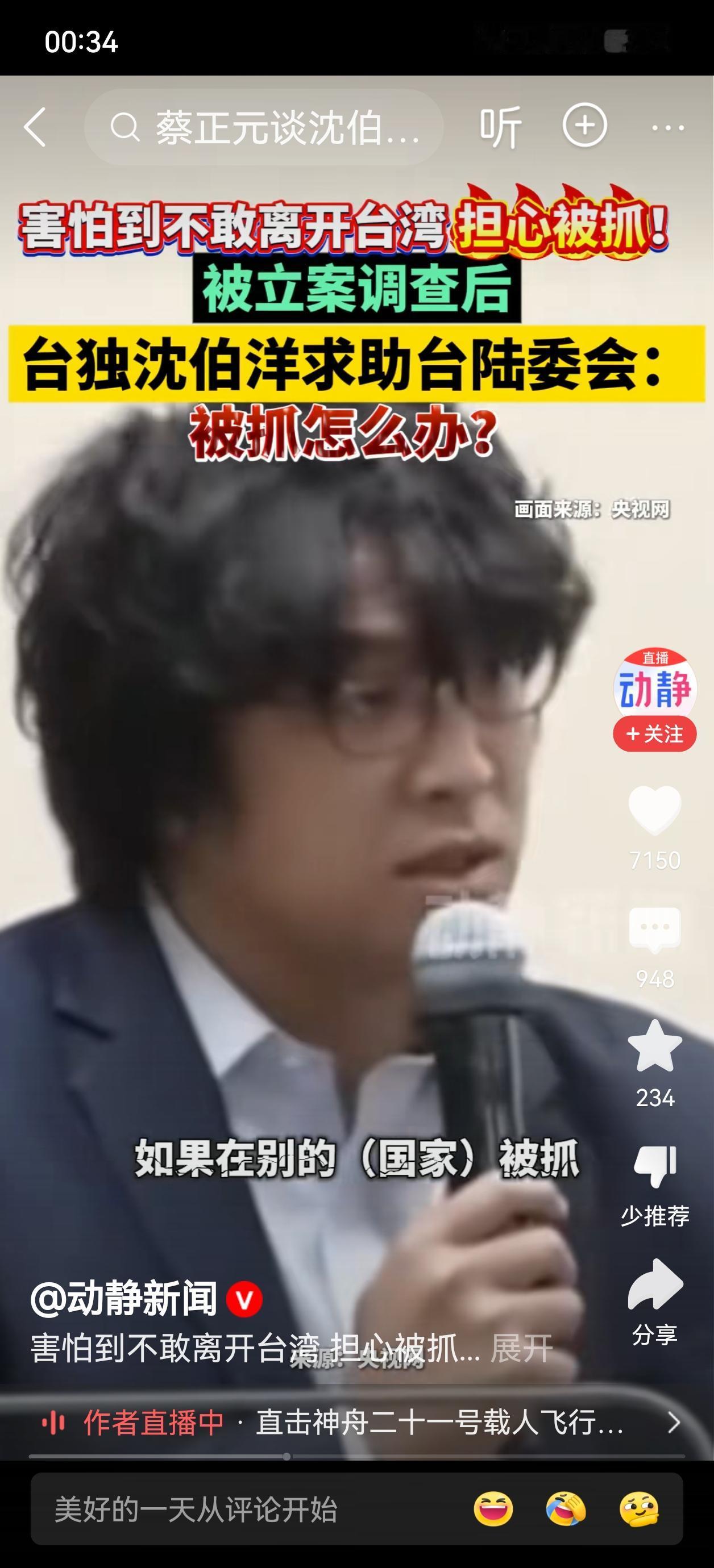 沈伯洋到底怕没怕,看这个询问陆委会的对话就知道了。 沈伯洋在立法机构质询时说,自己有个担心,自己不会去大陆,但如果在其他国家地区被抓然后引渡到大陆,该怎么办。 陆委会副主委回复说,我们建议大家谨慎做好风险评估。意思就是,你自求多福吧。 陆委会连电诈分子都接不回台湾,能接回沈伯洋? 他这真是饥不择食、慌不择路、狗急跳墙。