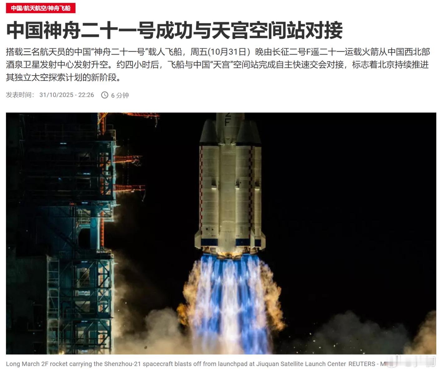 中国神舟二十一号成功与天宫空间站对接 搭载三名航天员的中国“神舟二十一号”载人飞船,周五(10月31日)晚由长征二号F遥二十一运载火箭从中国西北部酒泉卫星发射中心发射升空。约四小时后,飞船与中国“天宫”空间站完成自主快速交会对接,标志着北京持续推进其独立太空探索计划的新阶段。