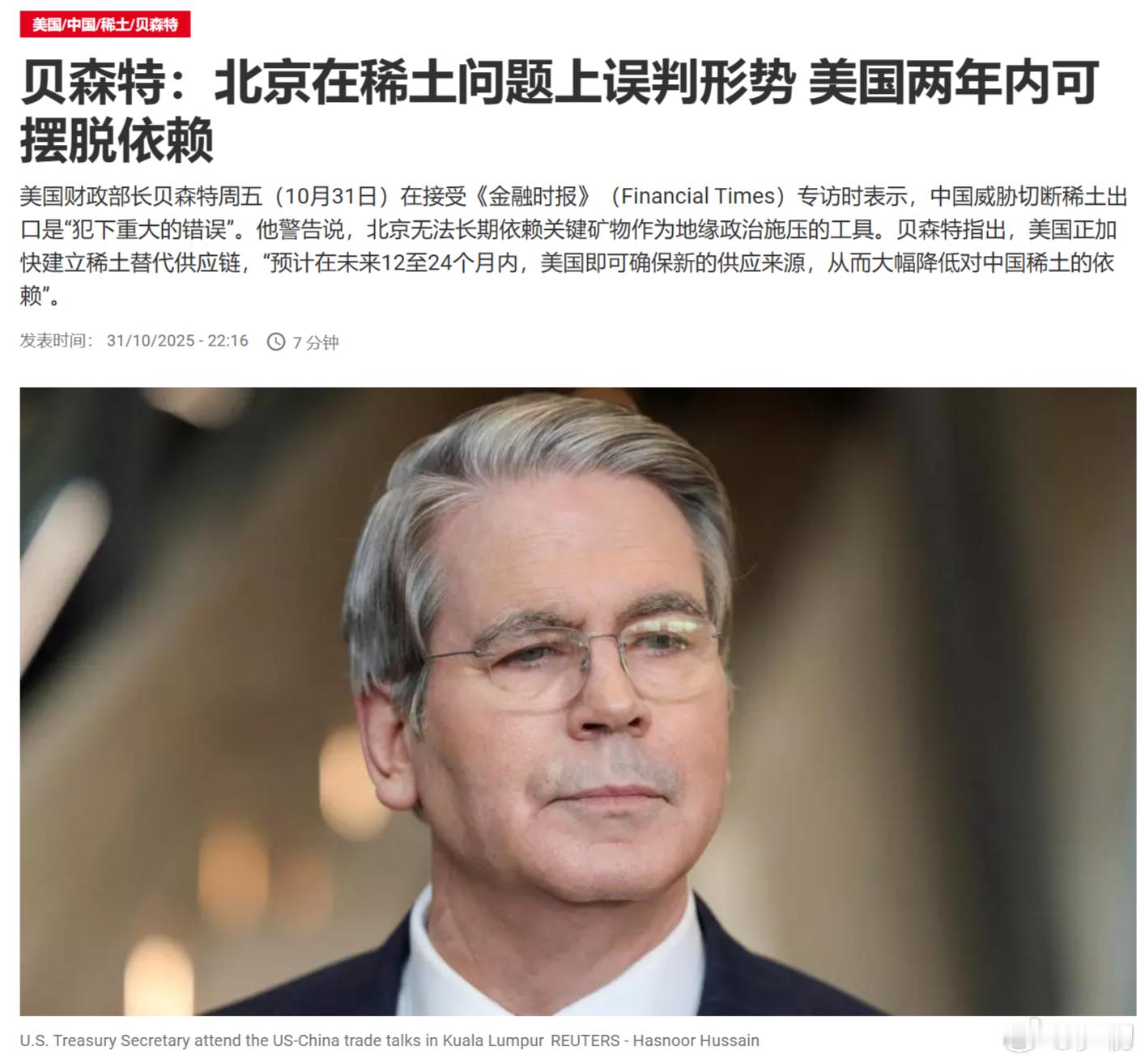 《金融时报》:美国财长贝森特表示,北京在稀土问题上“犯下重大的错误”,美国正加快建立稀土替代供应链,“预计在未来12至24个月内,美国即可确保新的供应来源,从而大幅降低对中国稀土的依赖”。
