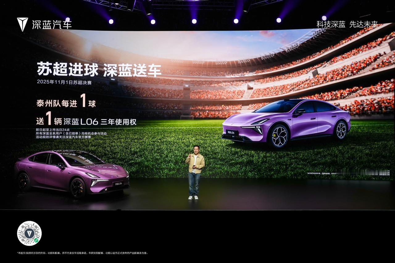重磅! 苏超决赛,深蓝送车! 关注11月1日晚7点35分苏超决赛! 泰州进一球,深蓝送一车! 即日起至深蓝L06上市当日24点,所有深蓝首任车主(含锁单)均有机会参与活动抽奖。 泰州队每进1球,深蓝将送1辆深蓝L06三年使用权。【来自懂车帝车友圈】