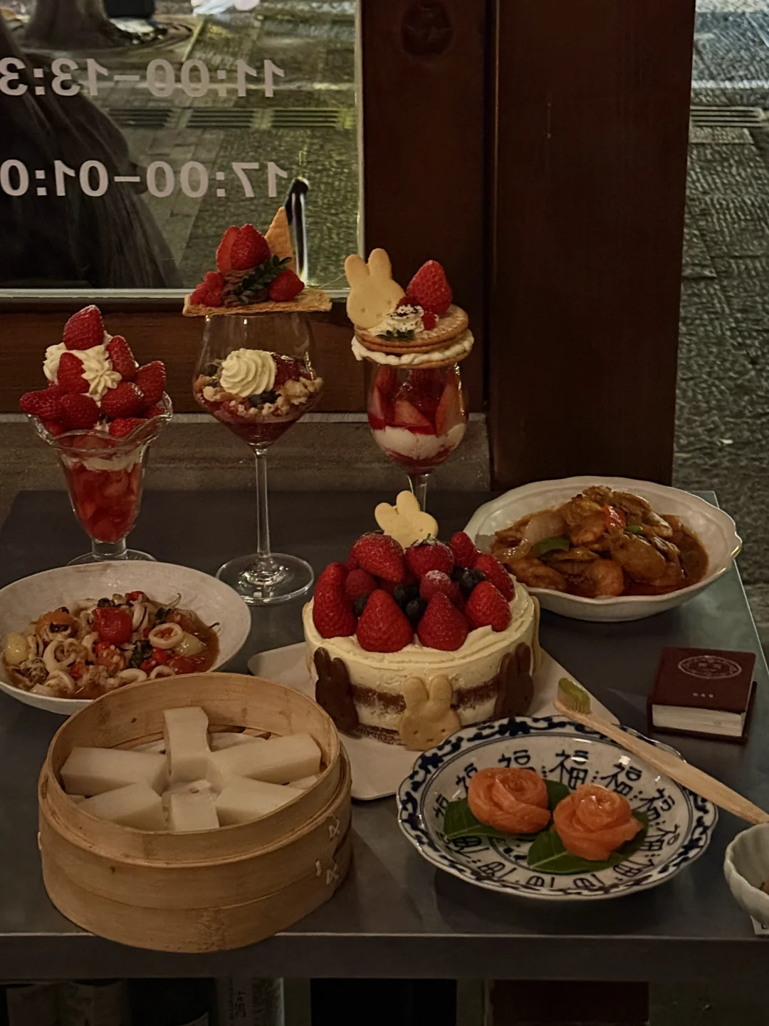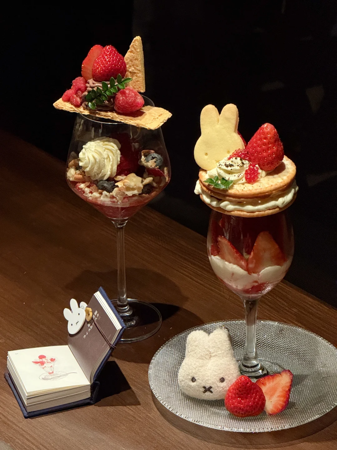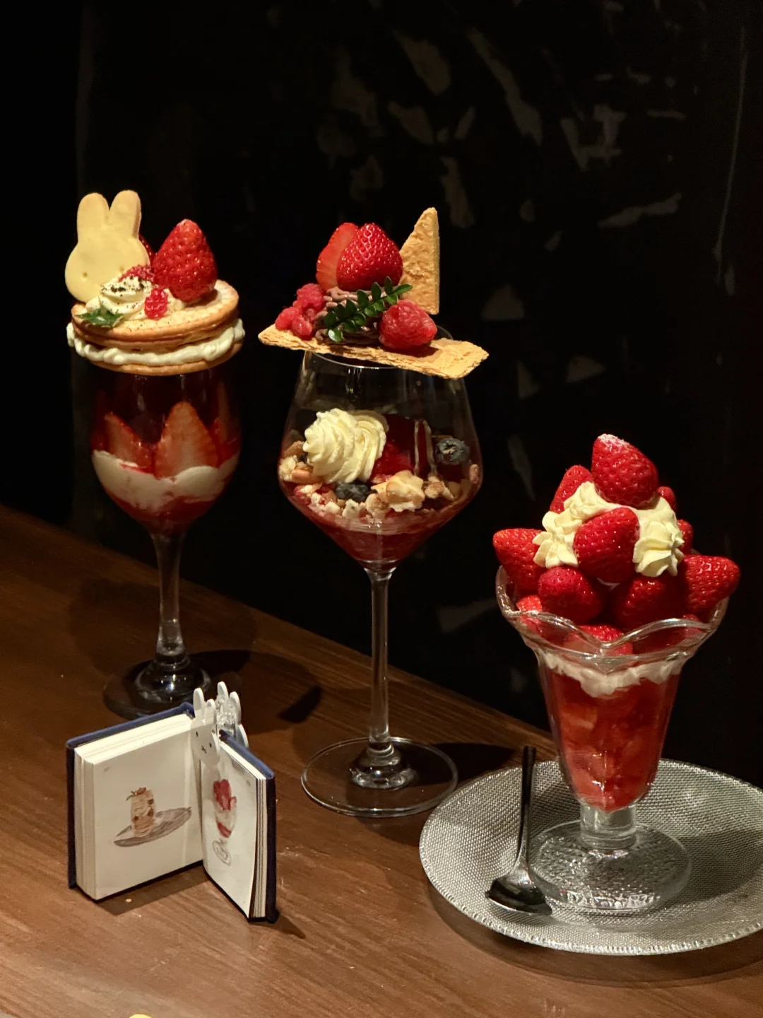 太美噜!!!三款草莓芭菲,各有特色,层次超丰富!好看又好吃…… 还有可爱的米菲草莓蛋糕🍰,好幸福!!!窗台边的位置,氛围感拉满了!