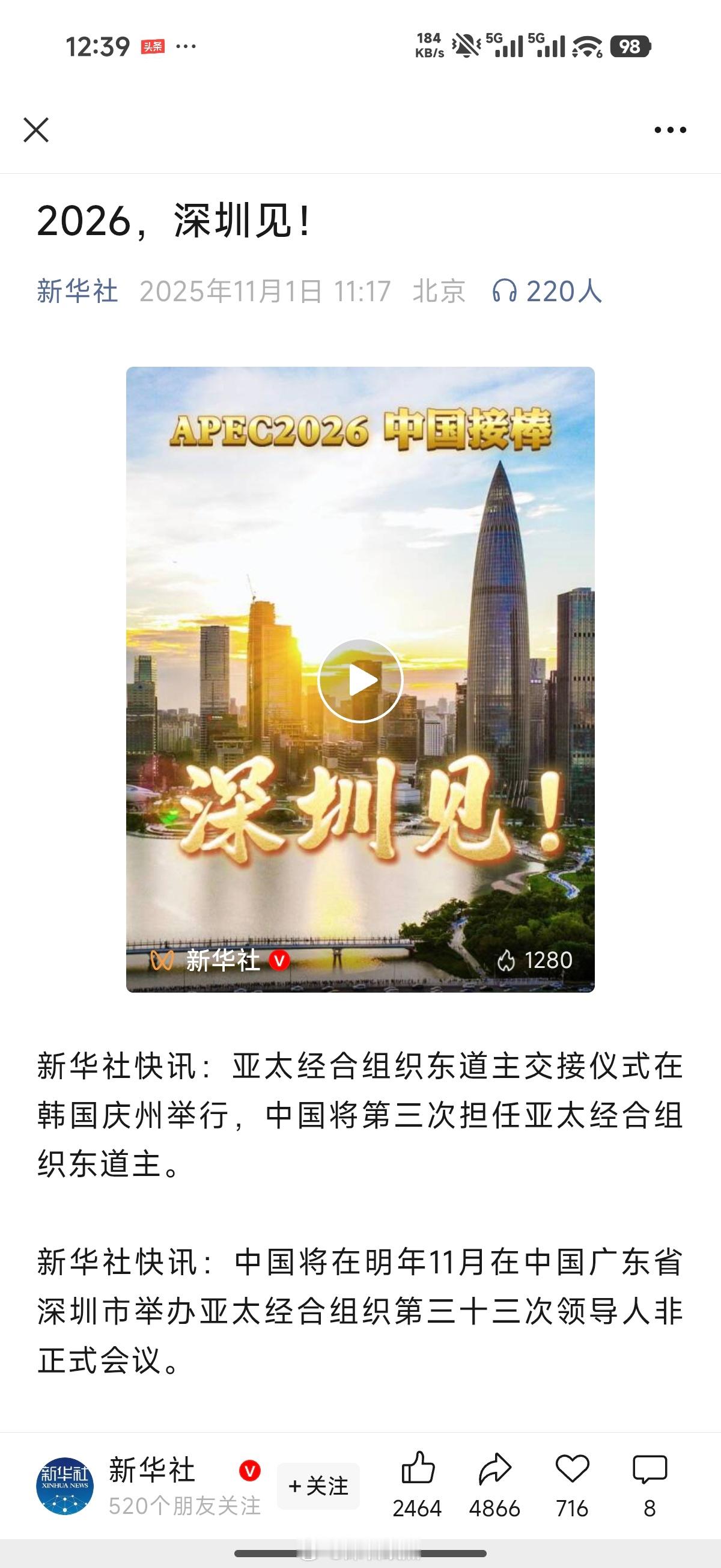 今天被群消息刷屏就是APEC2026领导人非正式会议在深圳召开。