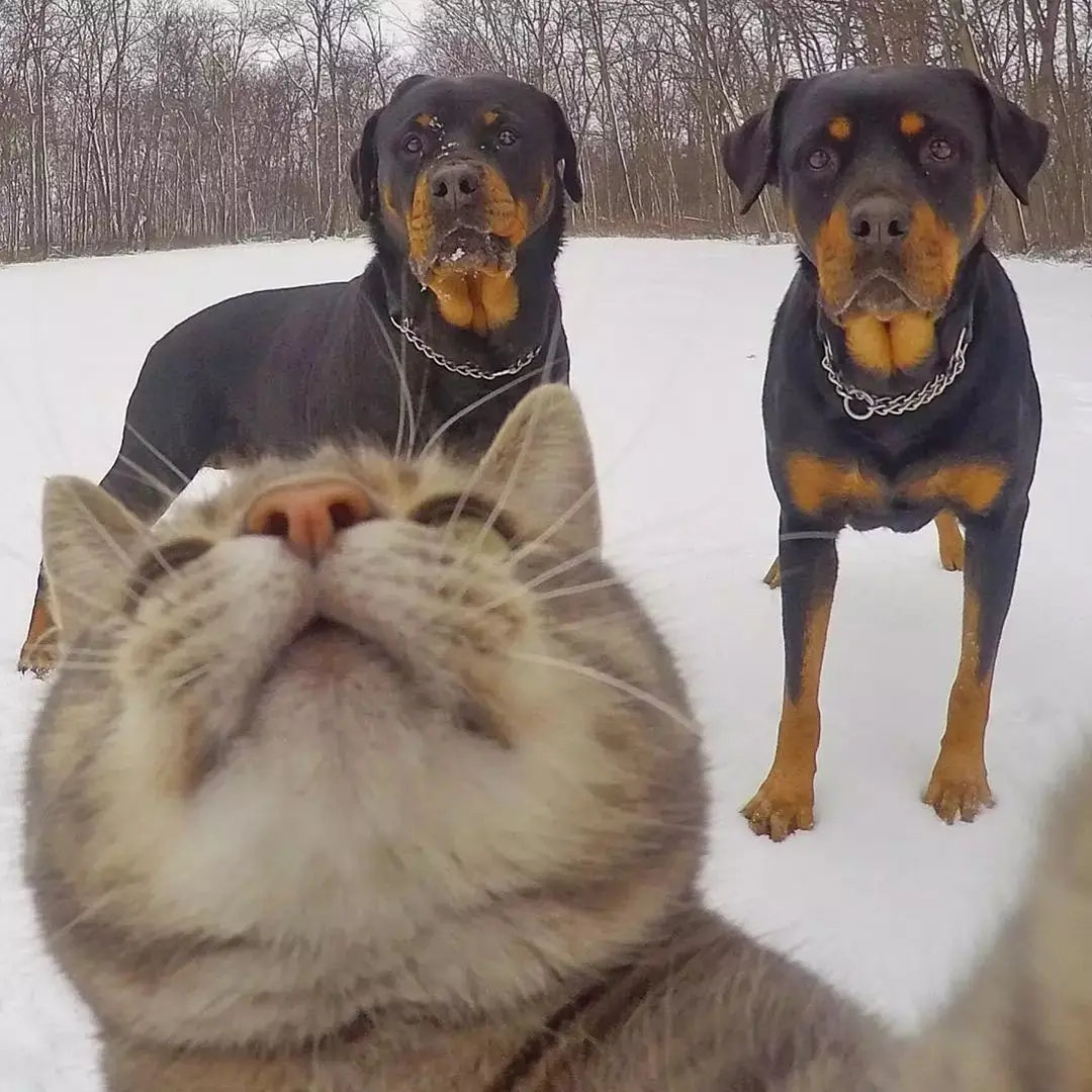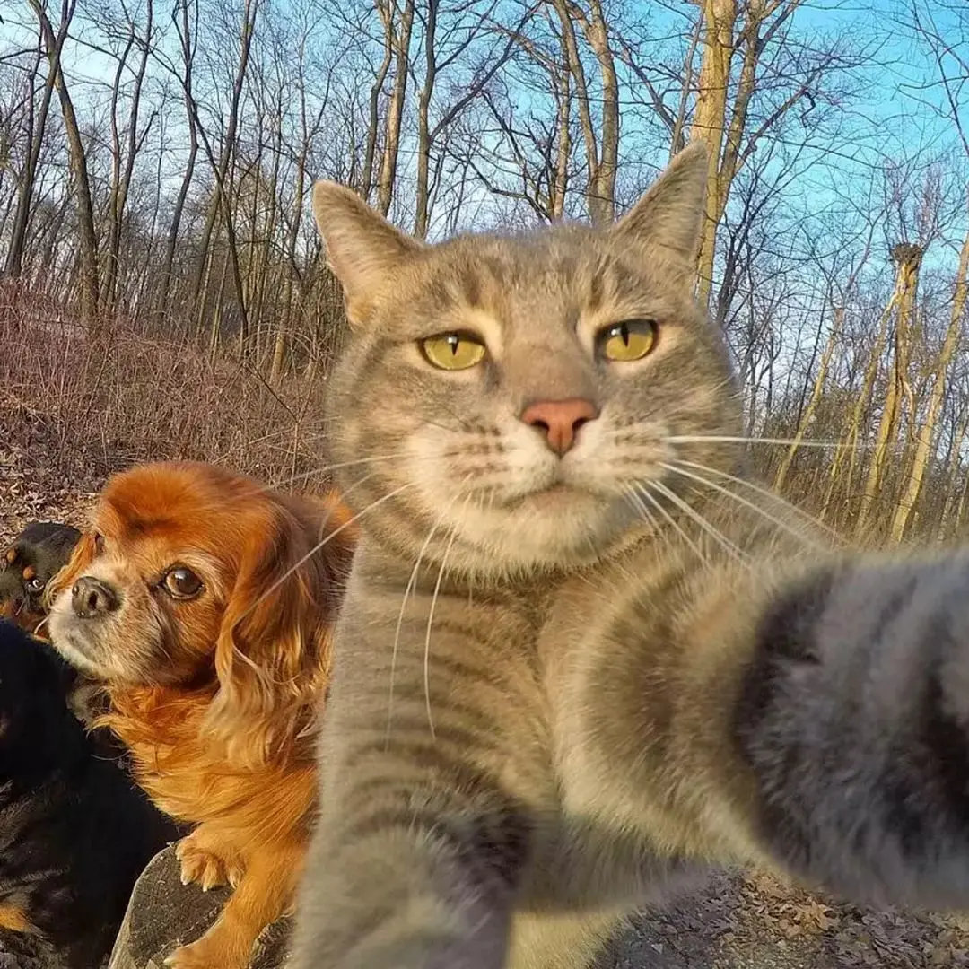 家人们快看!这只小猫带着狗狗们拍了一整套自拍~雪地、草地、晴天各种场景切换自如,表情一会儿呆萌一会儿搞怪,简直是动物界的自拍大师!你家宠物会“自拍”吗?