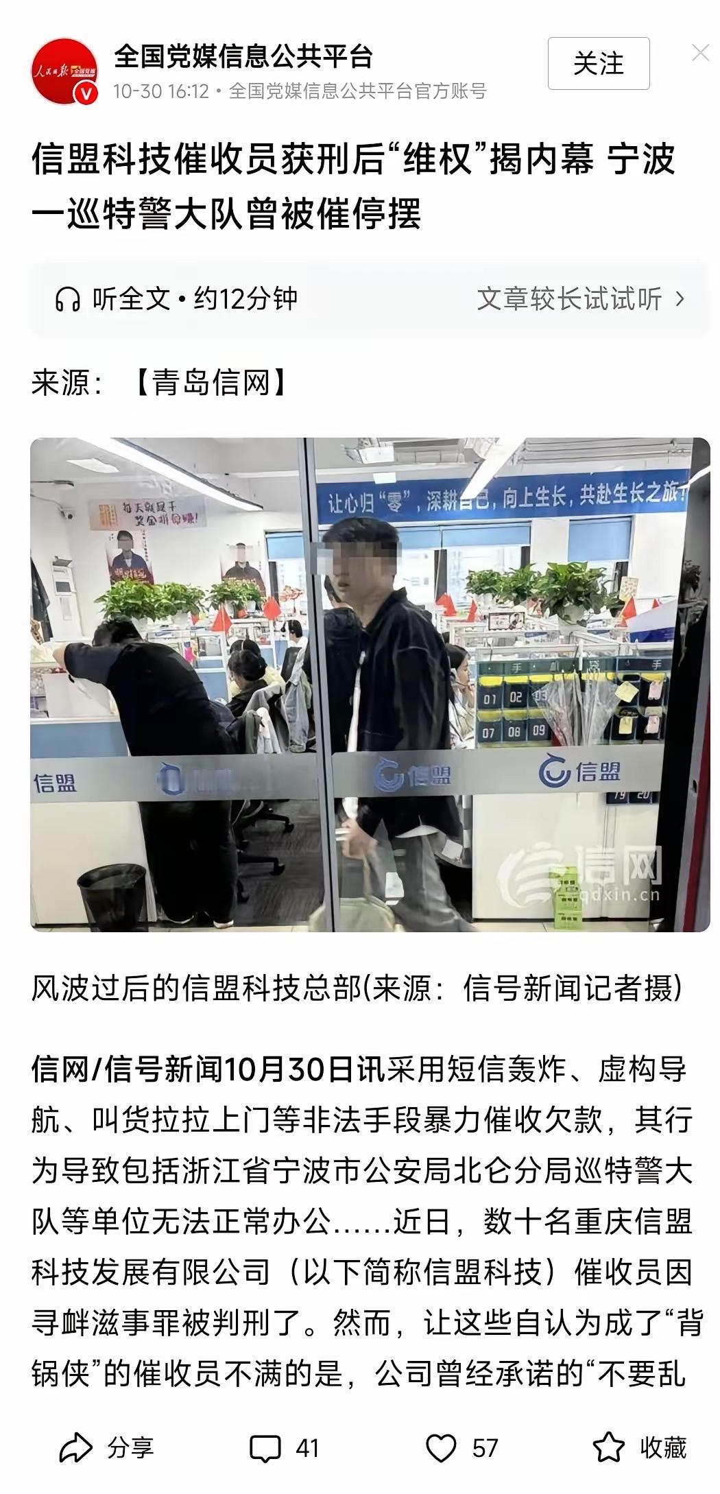 现在的催收也太丧心病狂了吧,催收都把巡特警大队给催停摆了。连警察他们都敢这么肆无忌惮,那普通人岂不是更难。也不知道老板给这些催收的多少工资,让这些人居然如此不择手段。 这事听着离谱,却是真实发生的闹剧——有巡特警大队的工作人员吐槽,单位座机一天能接到几十通催收电话,开口就问“你们队的某某是不是欠了钱”,甚至威胁“再不还钱就让他丢工作”。接线的民警反复解释“查无此人”,对方非但不听,还换着号码轮番轰炸,导致办公电话根本打不进来,正常出警调度都受了影响,这不就是活生生把执法部门给“催停摆”了? 能对巡特警大队下狠手,更别提普通老百姓要承受多大的压力。宁波刚破获的一起案件里,一个“软暴力”催收团伙119人被抓,他们光是伪造的“律师函”“立案通知”就堆了半间屋子,靠着电话轰炸、威胁恐吓,硬生生把北京一位欠款人逼得跳楼自尽。想想看,这些人连国家执法机关都敢骚扰,对付手无寸铁的普通人只会更无所顾忌:凌晨两三点打电话吵醒全家,把欠款信息群发给债务人的同事亲友,甚至蹲在小区门口堵人,就为了逼对方“要么还钱,要么崩溃”。 至于催收员为啥敢这么拼?答案就藏在他们的工资条里。重庆一家催收公司的招聘信息写得明明白白:底薪才三千多,但提成能拿到一万多,要是能啃下“难搞”的欠款,月收入能冲到两万以上,还有额外奖金可拿。这就不难理解他们的疯狂了——每催回一笔钱,自己口袋里就多一笔收入,至于手段合不合法、会不会逼出人命,根本不在他们的考量范围内。老板把催收变成“计件工资”,催得越狠赚得越多,底下的人自然把“不择手段”当成了工作信条。 更可怕的是,这些催收早把“套路”玩得炉火纯青,普通人稍不留意就会掉进陷阱。有债务人分享过经历:催收用私人手机号发“最后通牒”,落款写着“金融调解委员会”,看似官方实则全是造假,一旦你慌了神松口愿意协商,录音立马会被拿去当“还款承诺”。他们还擅长拿“影响子女上学”“冻结全部账户”这类话吓唬人,可实际上,借贷纠纷只是民事问题,根本不会牵连家人,这些说辞全是精心设计的心理战。 好在2025年新出台的催收规定,总算给这些疯狂行为套上了“紧箍咒”。新规明确划定了红线:催收只能在早上8点到晚上9点之间进行,夜间骚扰直接违法;更不能牵连亲友同事,频繁轰炸电话也算违规。最解气的是,要是催收方严重违规,债务人甚至可能不用还这笔钱——有法院就判过,因暴力催收导致欠款人精神受损的,债务直接一笔勾销。这可不是空话,宁波那伙催死人的催收员,已经因“催收非法债务罪”被采取刑事强制措施,等待他们的是牢狱之灾。 可新规再好,也得能落到实处。巡特警大队被骚扰、普通人被逼跳楼的案例,恰恰说明还有不少催收团伙在钻空子。这些人躲在暗处换着号码作案,甚至伪造公职人员身份,普通债务人很难固定证据。更让人费解的是,那些明目张胆招聘“高提成催收员”的公司,为啥能长期经营?监管的眼睛要是能再亮一点,早发现早查处,或许就能少些悲剧。 对普通人来说,面对违规催收别硬扛也别慌神。记住三句话:承认欠款但说明还款能力,拒绝任何不合理调解,保留好通话录音和短信证据。一旦对方越界,直接向银保监投诉,或者拿着证据报警——现在“催收非法债务罪”已经入刑,他们再横,也怕法律的重拳。 催收的本质是要回欠款,可一旦变成“逼命”,就彻底偏离了轨道。那些拿提成的催收员忘了,电话那头是活生生的人;那些赚黑心钱的老板更该明白,法律的红线碰不得。巡特警大队都能被骚扰,足以敲响警钟:整治违规催收,不能等出了人命才动手。 各位读者你们怎么看?欢迎在评论区讨论。