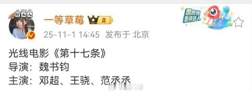 邓超要和范丞丞演电影啦,这也是邓超和范丞丞的首次合作,电影《第十七条》的剧情还挺带感的,不过也有网友调侃这部戏是偏女主,话说新电影的女主会是谁呢,坐等官宣了!