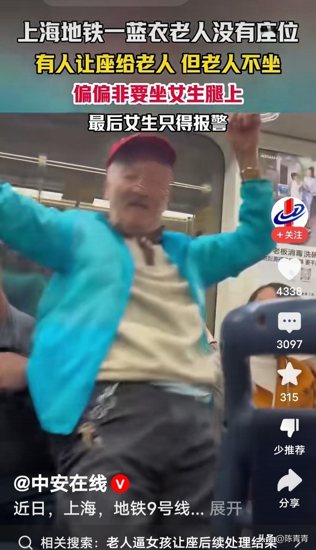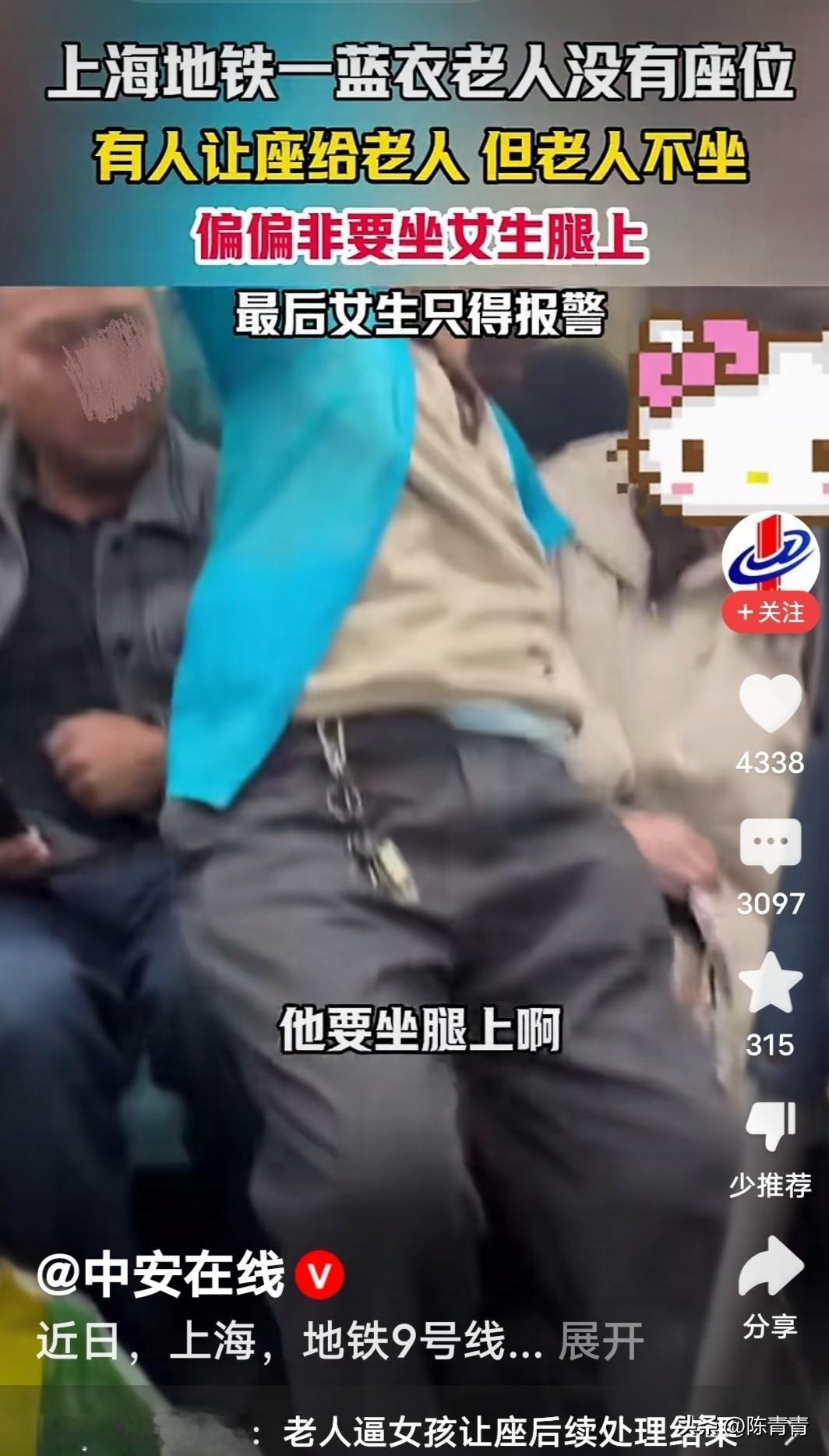 在地铁上,有人给穿天蓝色衣服老头让座,老头不坐,嬉皮笑脸的非要坐在女孩子身上。这做的啥事? 老头身后有一男子,紧挨着男子旁边是女孩子。老头往女孩子身上靠,男子看不下去,边推揉老头,嘴里说着狠话,想以此警告老头。 老头是见过世面的人,根本不把旁人的警告当回事,还嬉皮笑脸的往女孩子身上坐。 旁边有个女的说,“给他(老头)让座不要,非要坐女孩子身上。” 有的说,“对付这种老人,第一次退休工资减半。第二次退休工资停发。看谁还敢这样。” 有的说这事得报警。确实挺难的,看年龄至少也70多岁,说扣发退休工资,这都是气话。你说碰到为老不尊的人咋办?