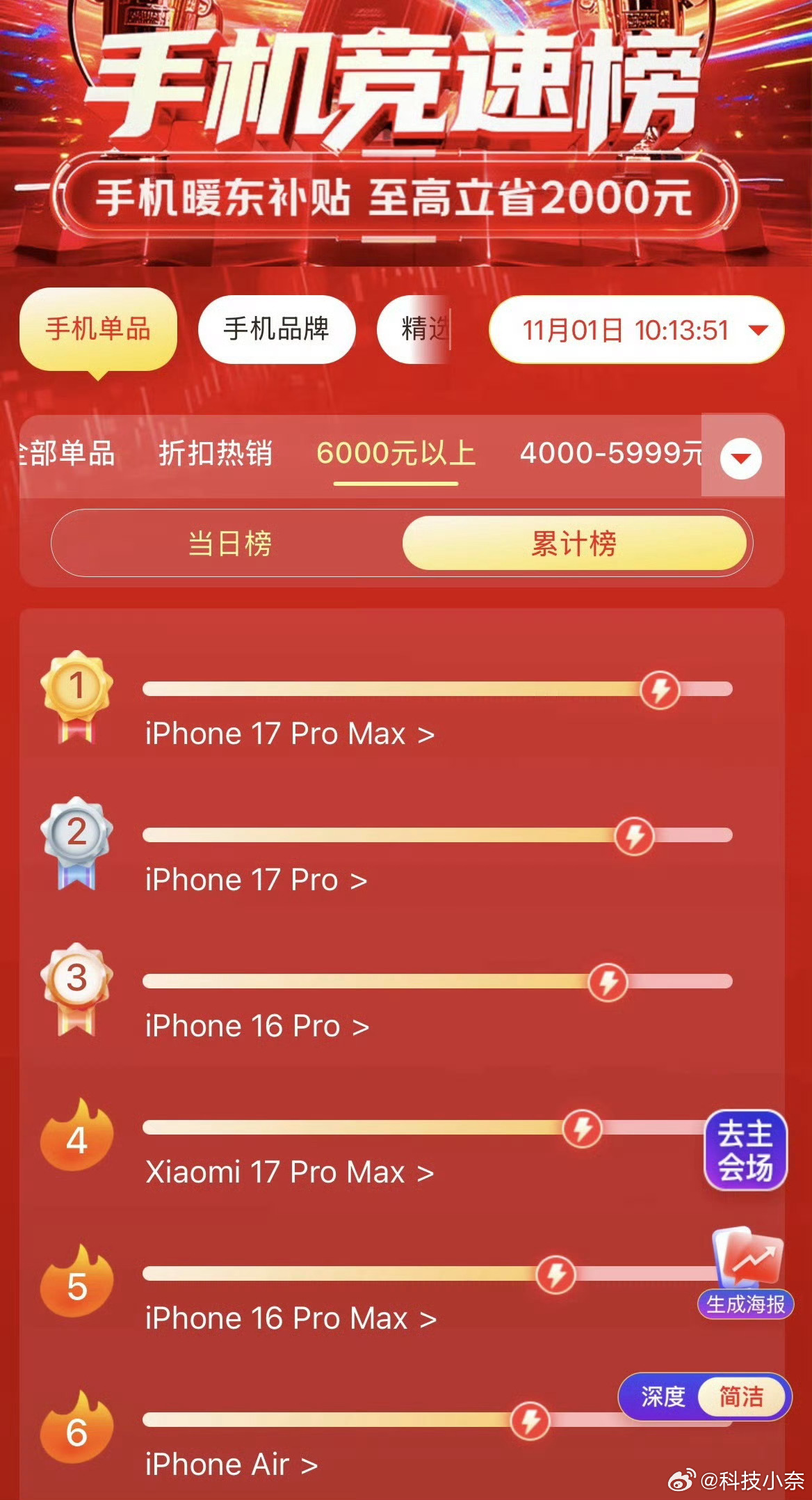 猛,小米17 Pro Max包揽全平台6k+价位段销量、销额双冠。苹果领跑小米紧随,这把小米的变阵直接让其在高端站稳住脚了。