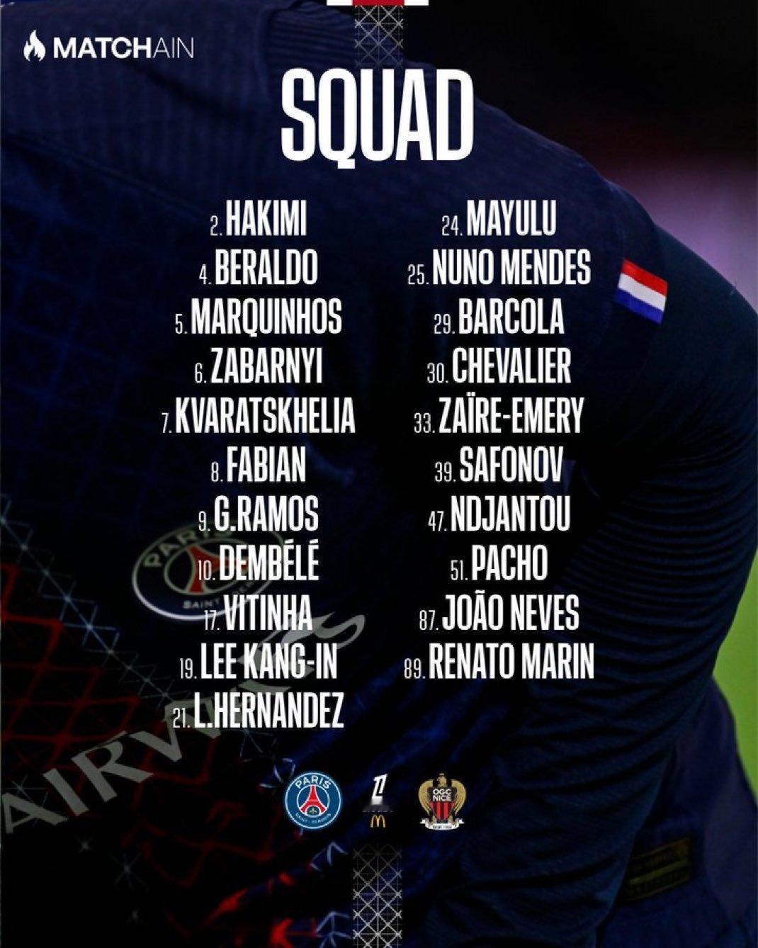 🚨📃 | 巴黎圣日耳曼对阵尼斯队的阵容: