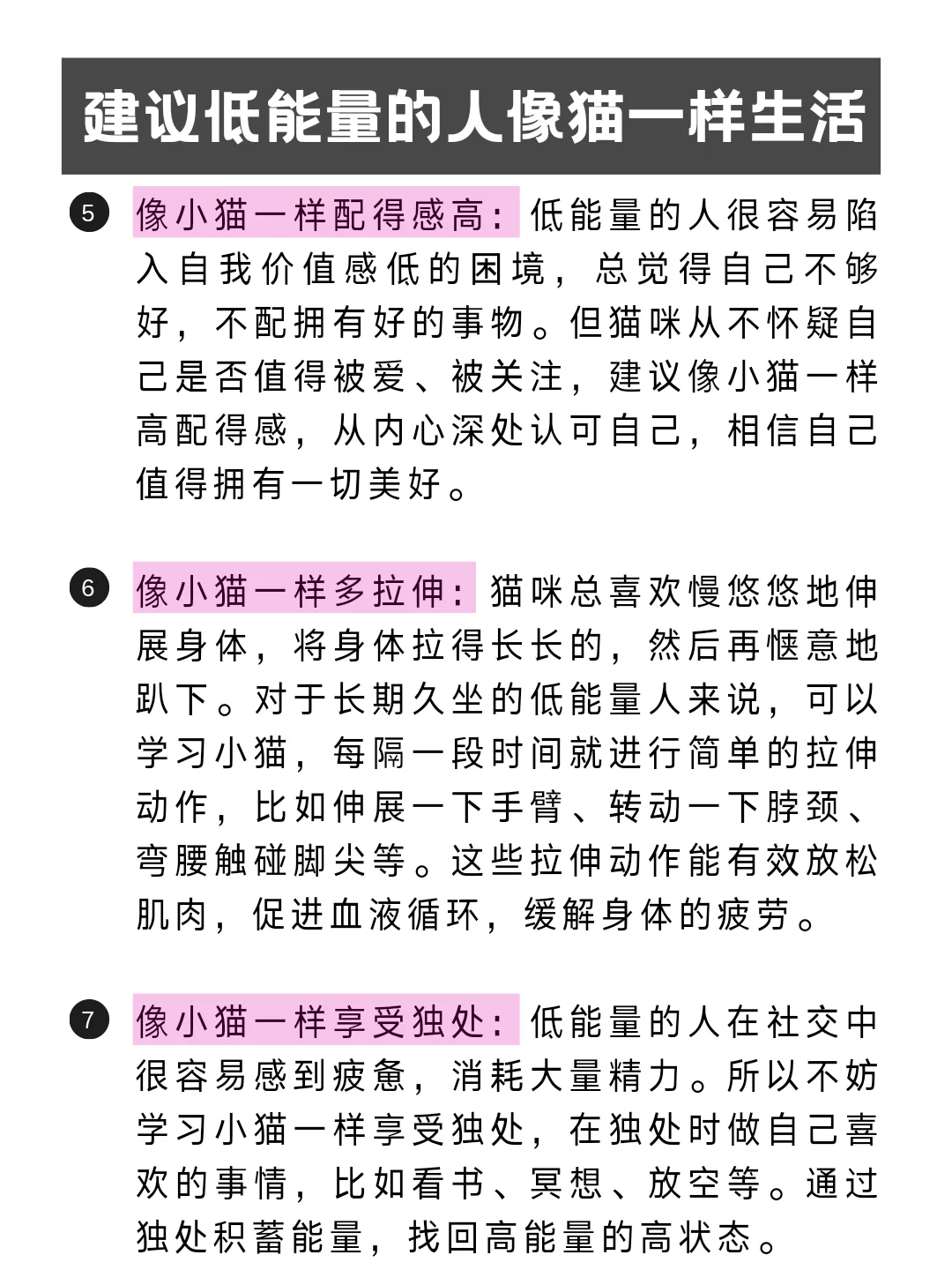 像小猫一样配得感高:低能量的人很容易陷入自我价值感低的困境,总觉得自己不够好,不配拥有好的事物。但猫咪从不怀疑自己是否值得被爱、被关注,建议像小猫一样高配得感,从内心深处认可自己,相信自己值得拥有一切美好。