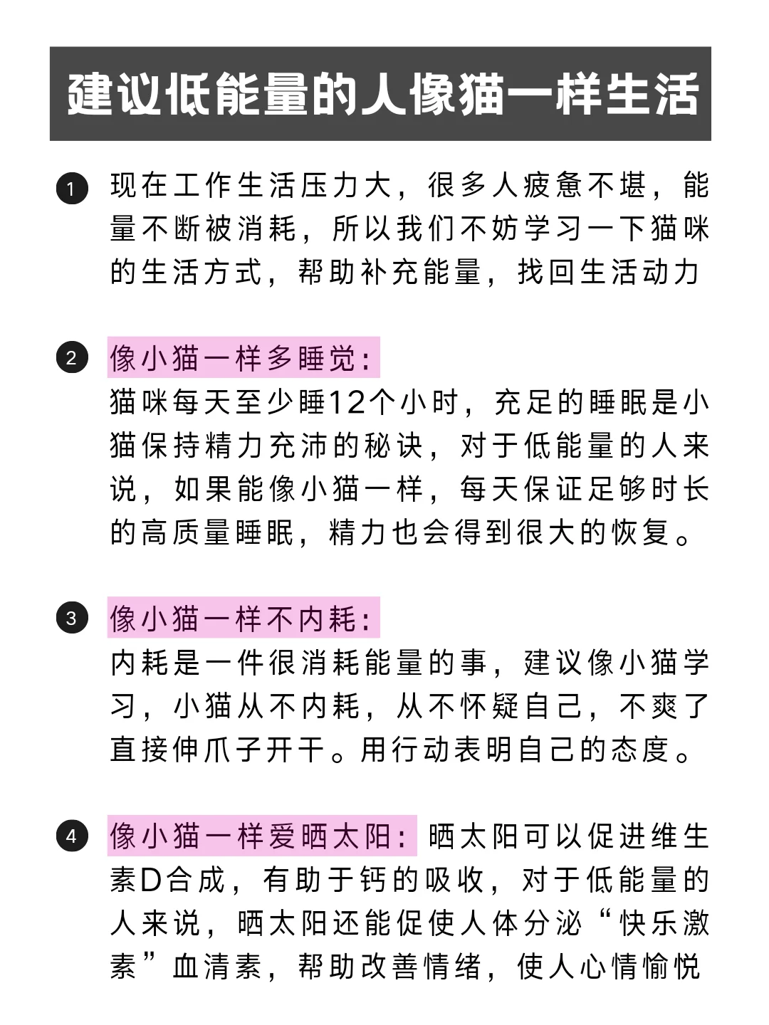 现在工作生活压力大,很多人疲惫不堪,能量不断被消耗,所以我们不妨学习一下猫咪的生活方式,帮助补充能量,找回生活动力