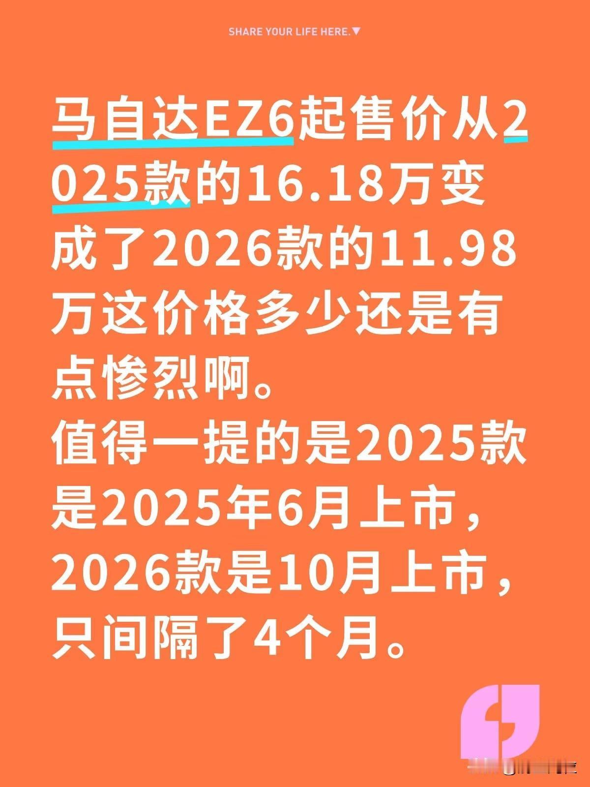 马自达EZ6起售价从2025款的16.18万变成了2026款的11.98万这价格多少还是有点惨烈啊。 值得一提的是2025款是2025年6月上市,2026款是10月上市,只间隔了4个月。