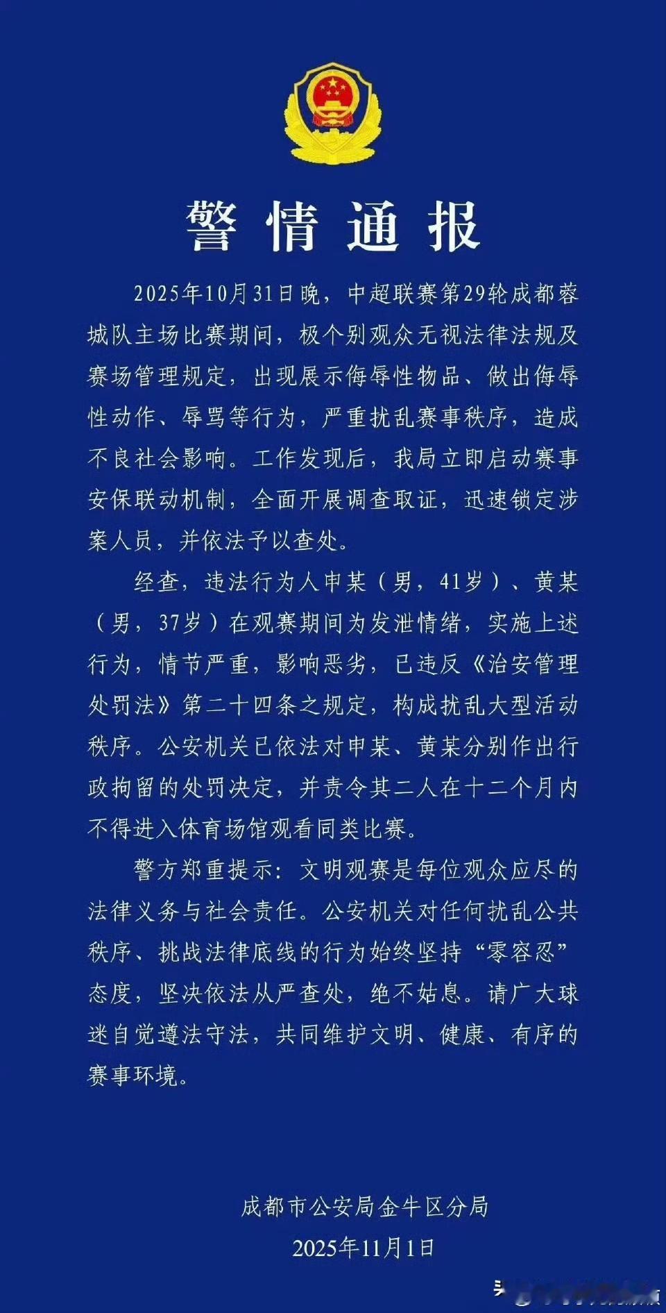 中超~成都蓉城极端球迷被绳之以法! 足球场也不是法外之地,周五进行的中超联赛第29轮比赛中,两名侮辱河南队外援阿奇姆彭的极端球迷,经过👮叔叔的调查取证,迅速将二人绳之于法,并禁止进入球场1年! 看球就是看球,不要以为你可以在球场随便发泄,做人要守住道德底线,否则是过街老鼠人人喊打! 记住了吗?蓉城部分极端球迷?!中超 成都蓉城 中超城市蓉城 成都蓉城队 蓉城对河南