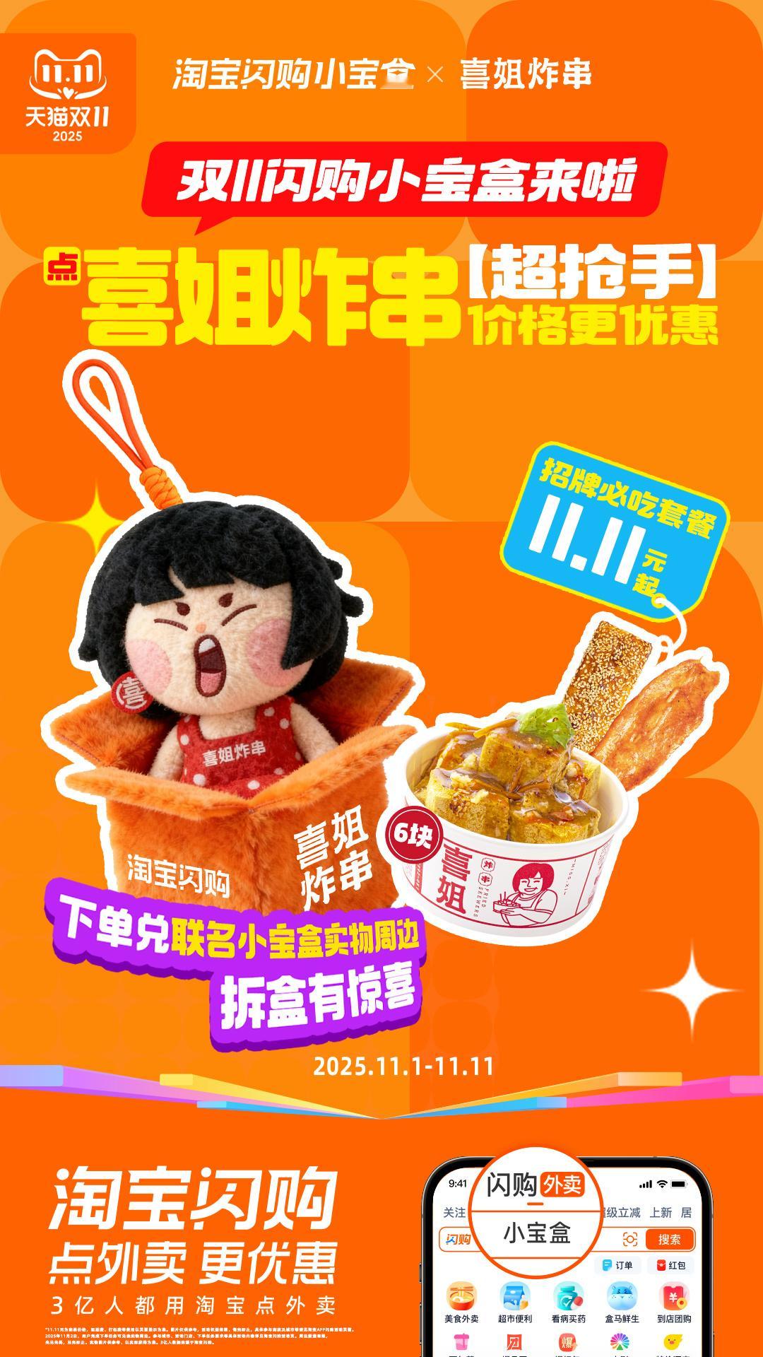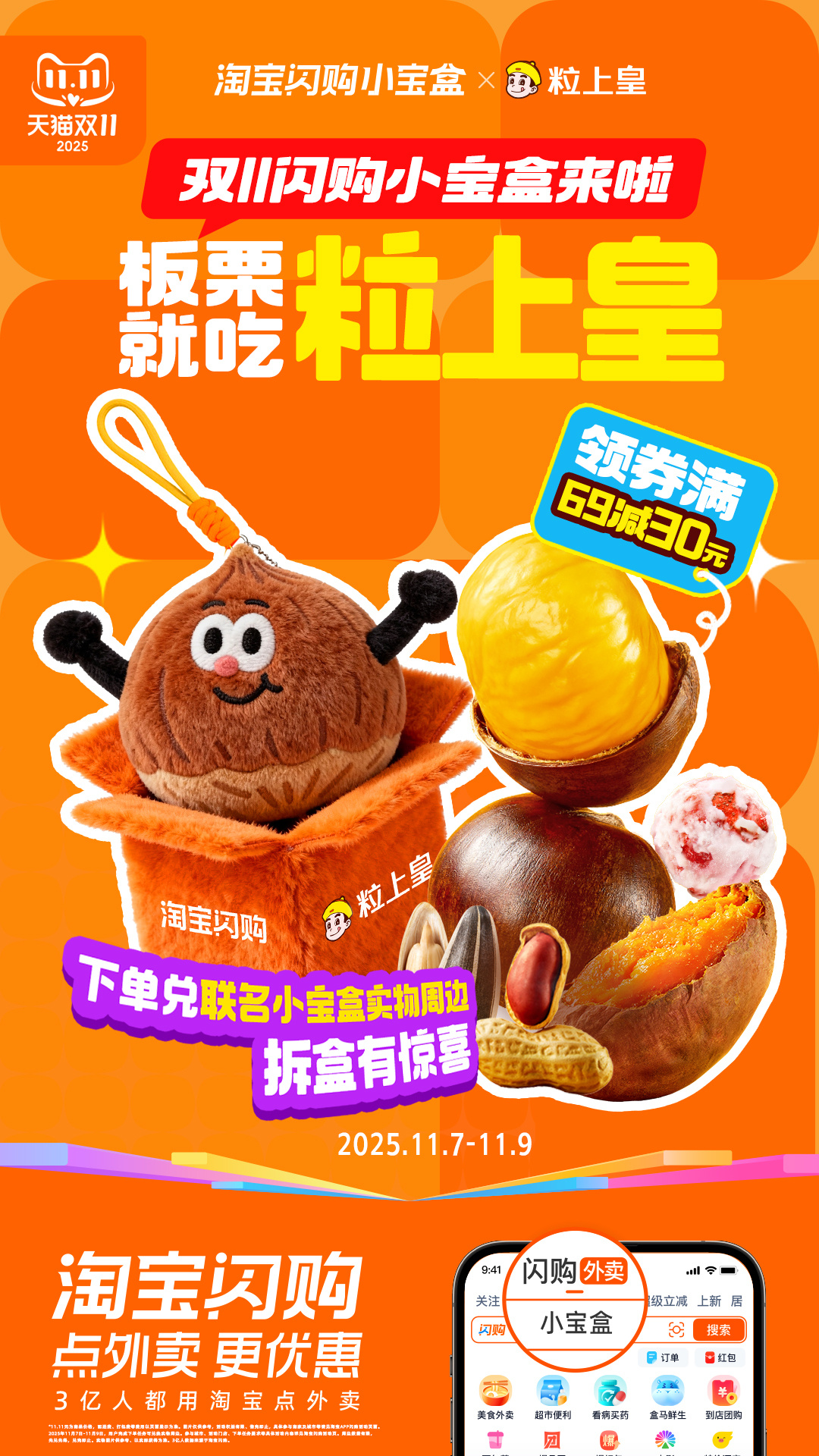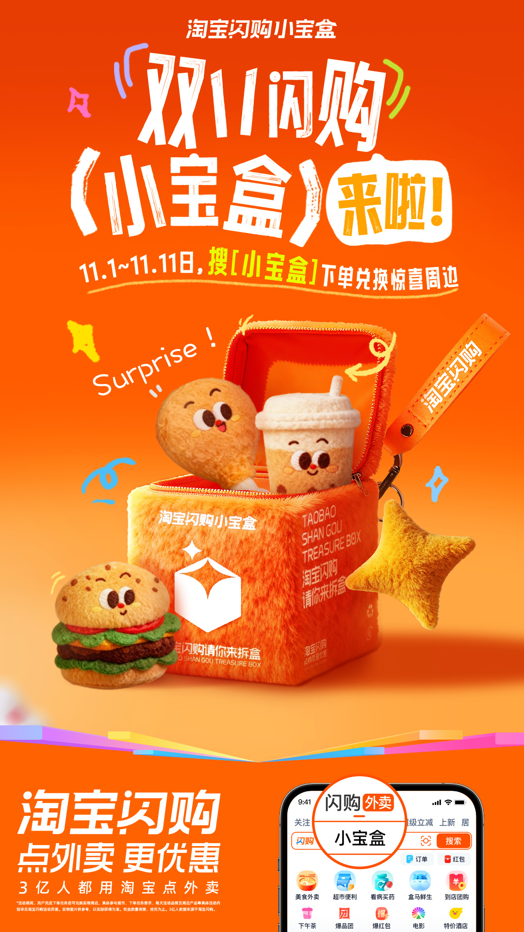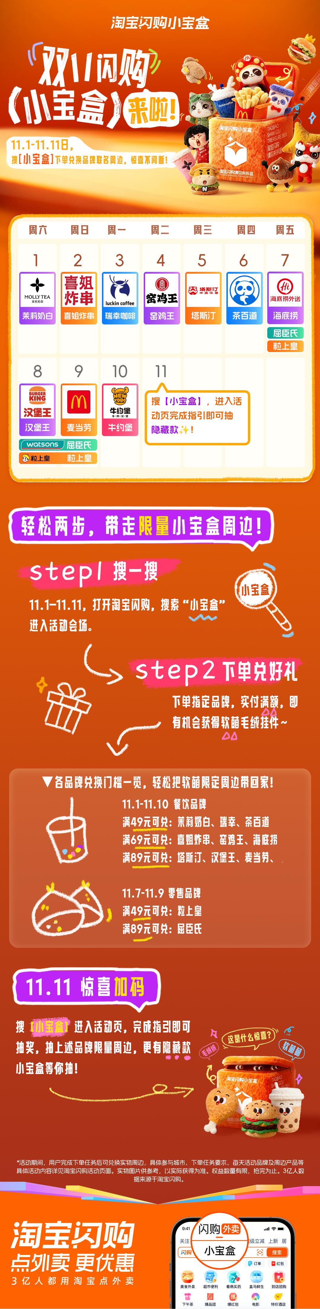 11.1-11.10上淘宝闪购搜索「小宝盒」,每日一个品牌专属会场,下单指定品牌,实付满额,即有机会参与兑换周边。11.11日进入活动页面按提示完成操作即可参与抽奖,不仅有机会赢取品牌限定周边,还有隐藏款小宝盒等你拿!更有11.11元起的大牌美食,超抢手价格更优惠哦。这波治愈系暴击,我先抢为敬!