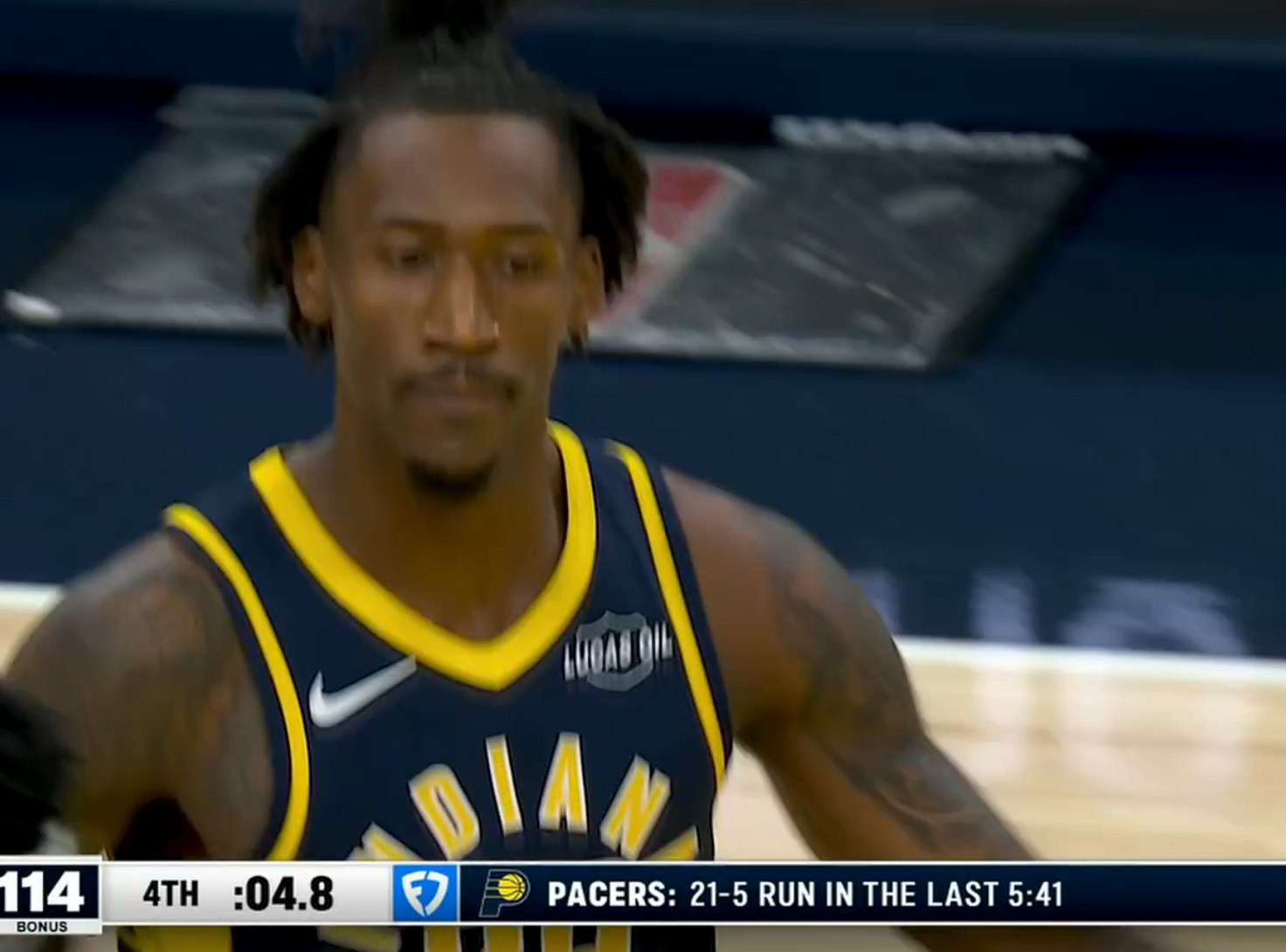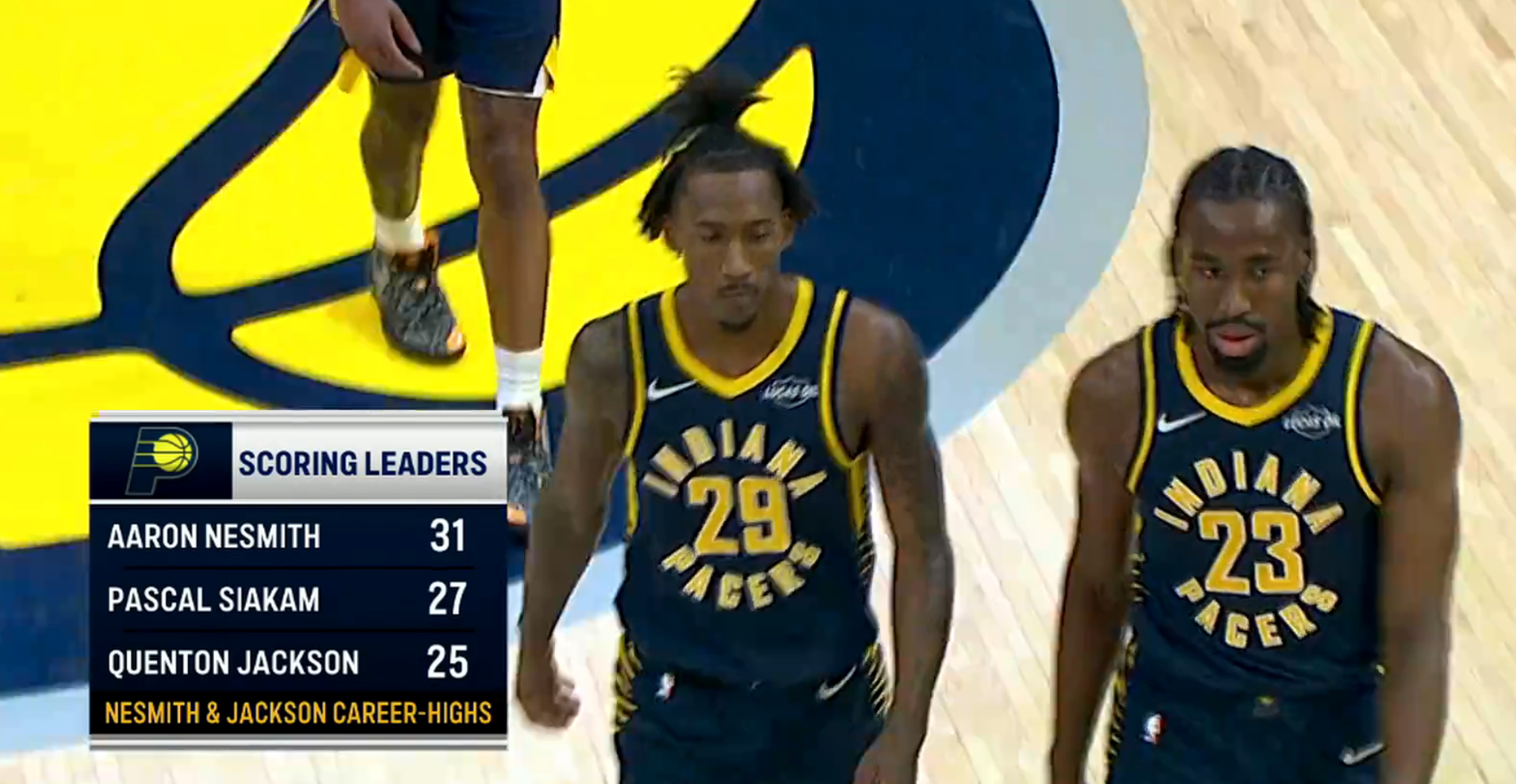 步行者后卫昆顿-杰克逊打出生涯之战,25分6篮板10助攻3抢断,命中锁定胜局的打板投篮!