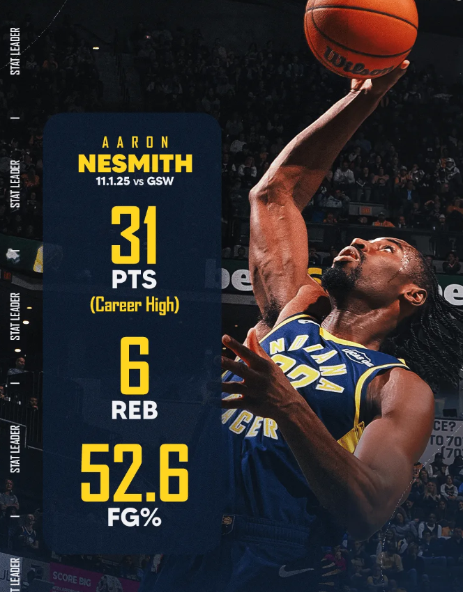 内史密斯砍下31分刷新生涯单场得分新高,生涯第二次得分30+ 今天NBA常规赛步行者主场对阵勇士的比赛已经结束。全场战罢,步行者以114-109战胜勇士。 本场比赛,步行者球员阿伦-内史密斯出战35分钟,19投10中,其中三分球11投5中,罚球6投6中,得到31分6篮板1助攻。 内史密斯本场砍下31分刷新生涯单场得分新高,此前最高为上赛季打雄鹿拿30分,也是生涯第二次单场砍下30+。