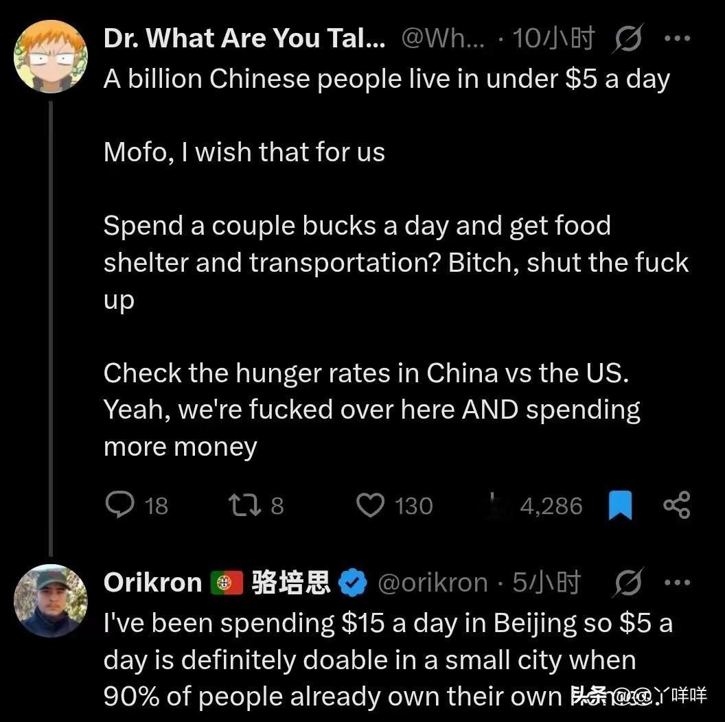 在国外媒体上美国人发表嘲讽中国的一段话: “你们中国人真的好穷,10亿的人口每天的生活费的只有5美元,折合人民币35元,恐怕连饭都吃不饱吧?[呲牙][呲牙]” 其实,这明显表露出美国人的无知,35元在美国真的无法吃饱饭,会饿死的,但在中国真的可以能够三顿顿顿两菜一汤,还能有新鲜的水果吃[笑]这是欧美人很难想到的,也不愿意相信的事实