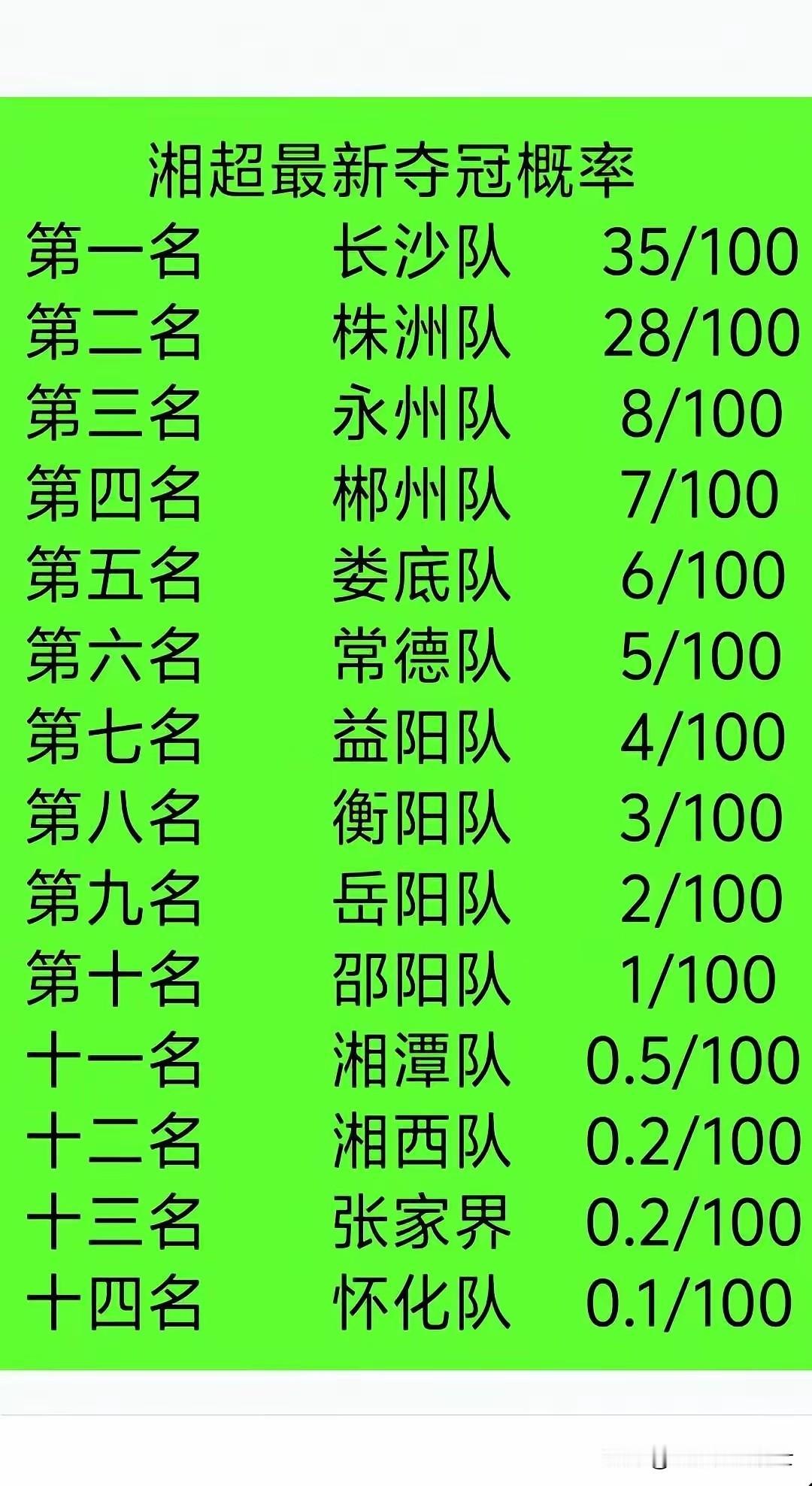 不要太高看了湘超永州队! 从湘超永州队1:1战平长沙队,并率先打破长沙队零失球的神话,特别是永州队战胜益阳队四胜四平积分16分后,不少球迷不仅把永州队当成湘超的最大黑马,而且开始将永州队当成一支强队了。有的认为,到湘超比赛的最后,永州队会成为亚军。 有的还神算出了湘超各队夺冠的概率,认为长沙队35%,株洲队28%,永州队8%,排夺冠率的第三名,此其他十一支队伍都要高,会成为湘超夺冠的第三支球队。 永州队在已经过去的湘超八轮比赛中,之所以成为湘超比赛以来唯二的两支不败球队之列,最根本的不在于他们的球技超群出众,而在于他们的顽强拼搏和团结拼命,以及将运气转为进球的敏感性。 希望永州队越踢越强,永往直前,冲锋出自己最好的成绩!