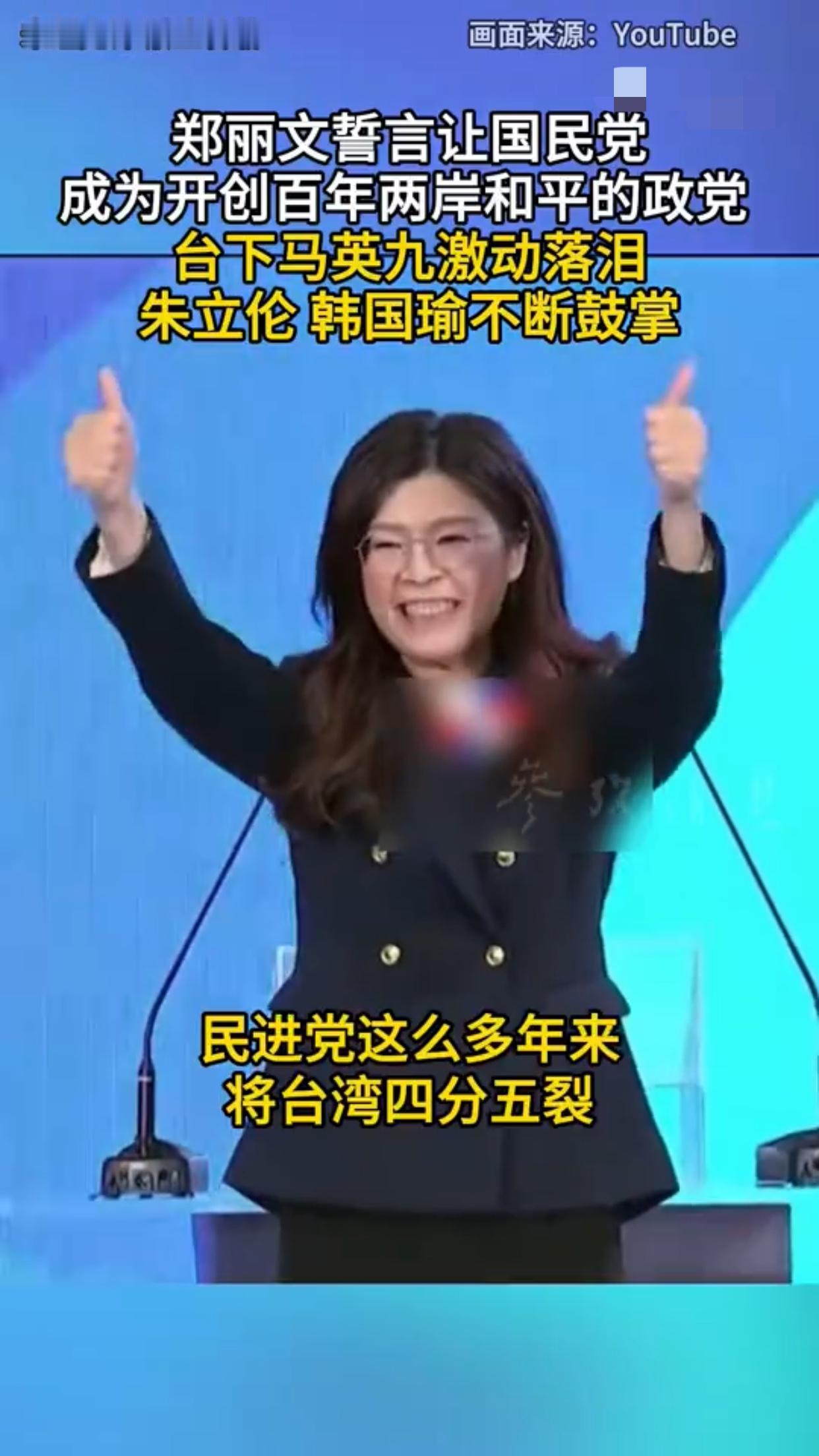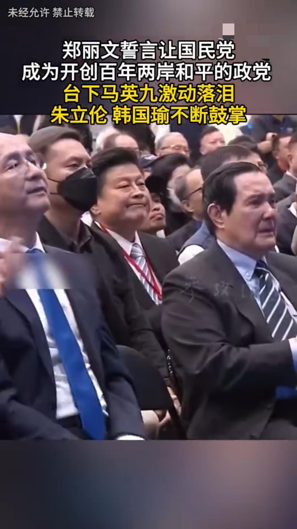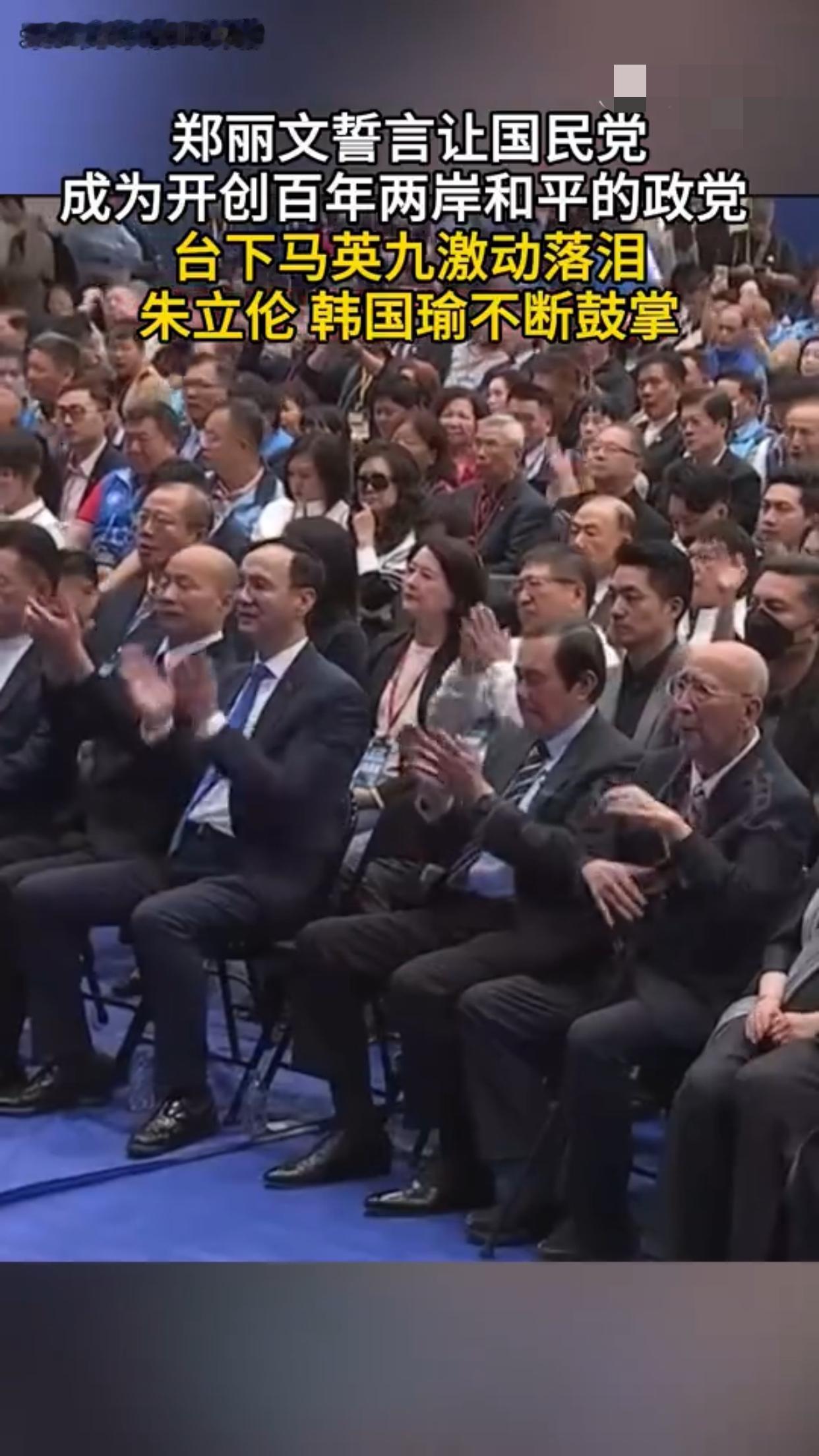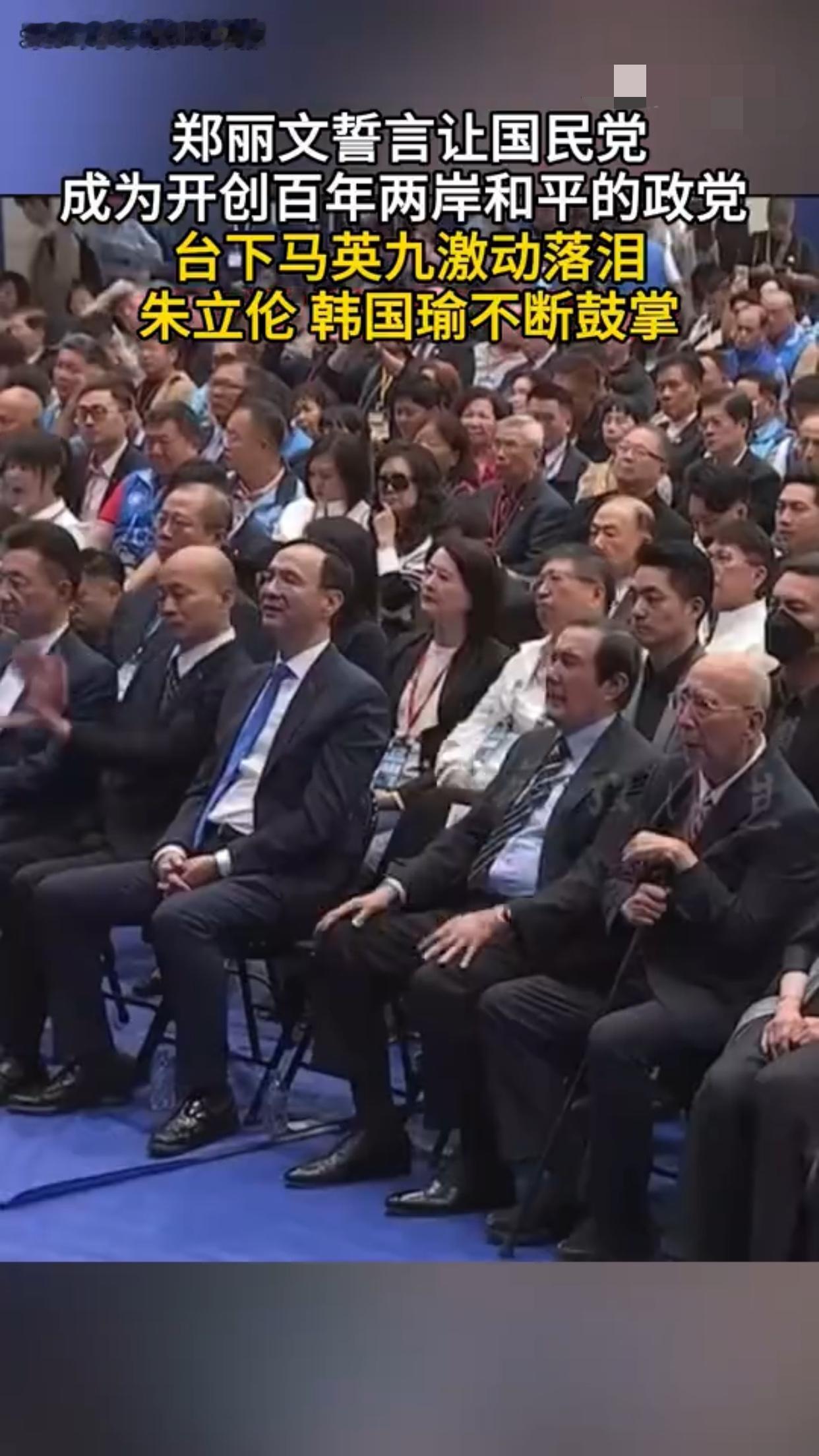 台湾国民党郑丽文表示:“民进党这么多年来将台湾四分五裂,国民党绝对会是开创百年两岸和平,带领台湾的最重要的政党。” 台下马英九、朱立伦 、韩国瑜等人感动流泪,纷纷鼓掌支持。