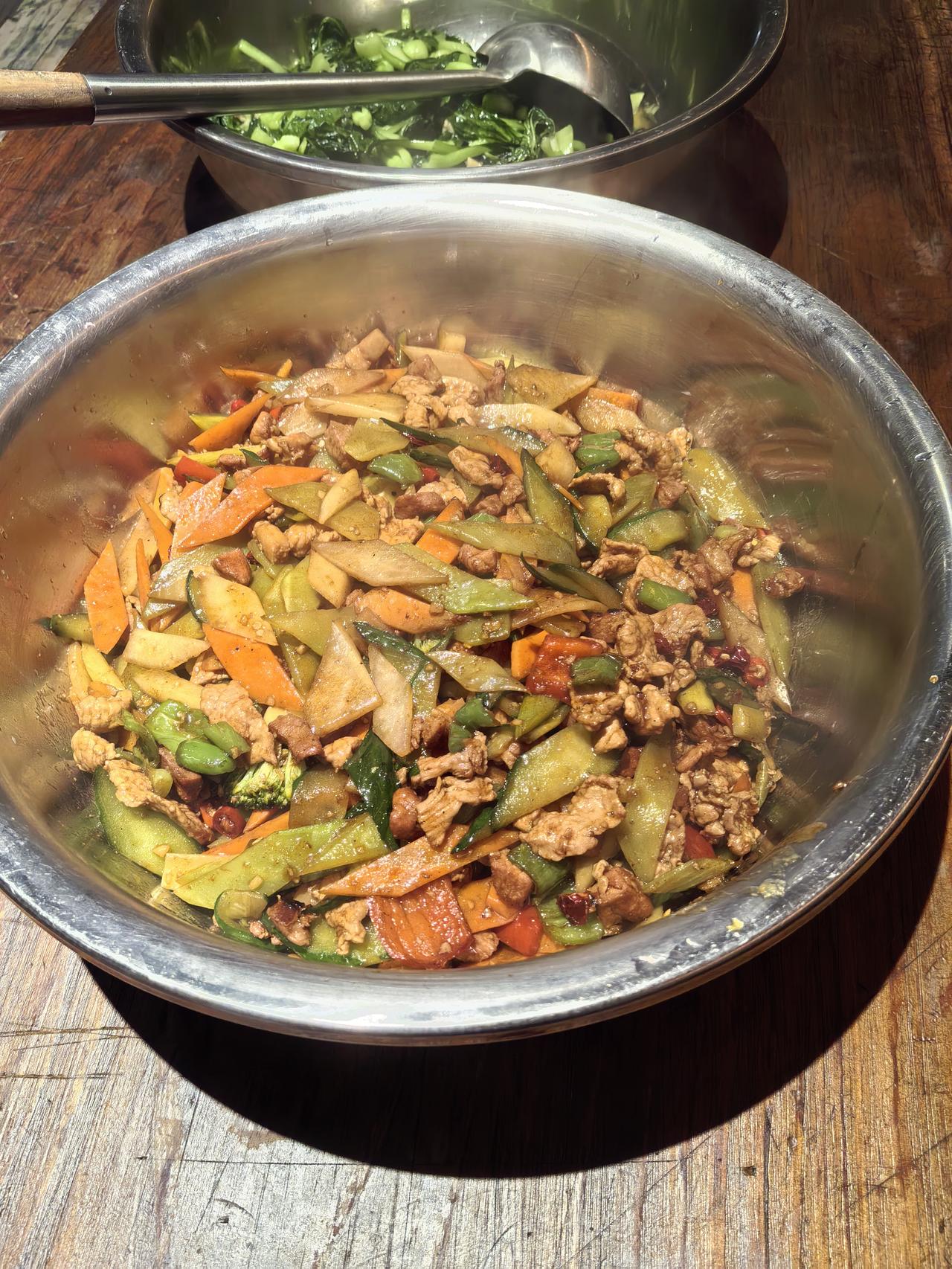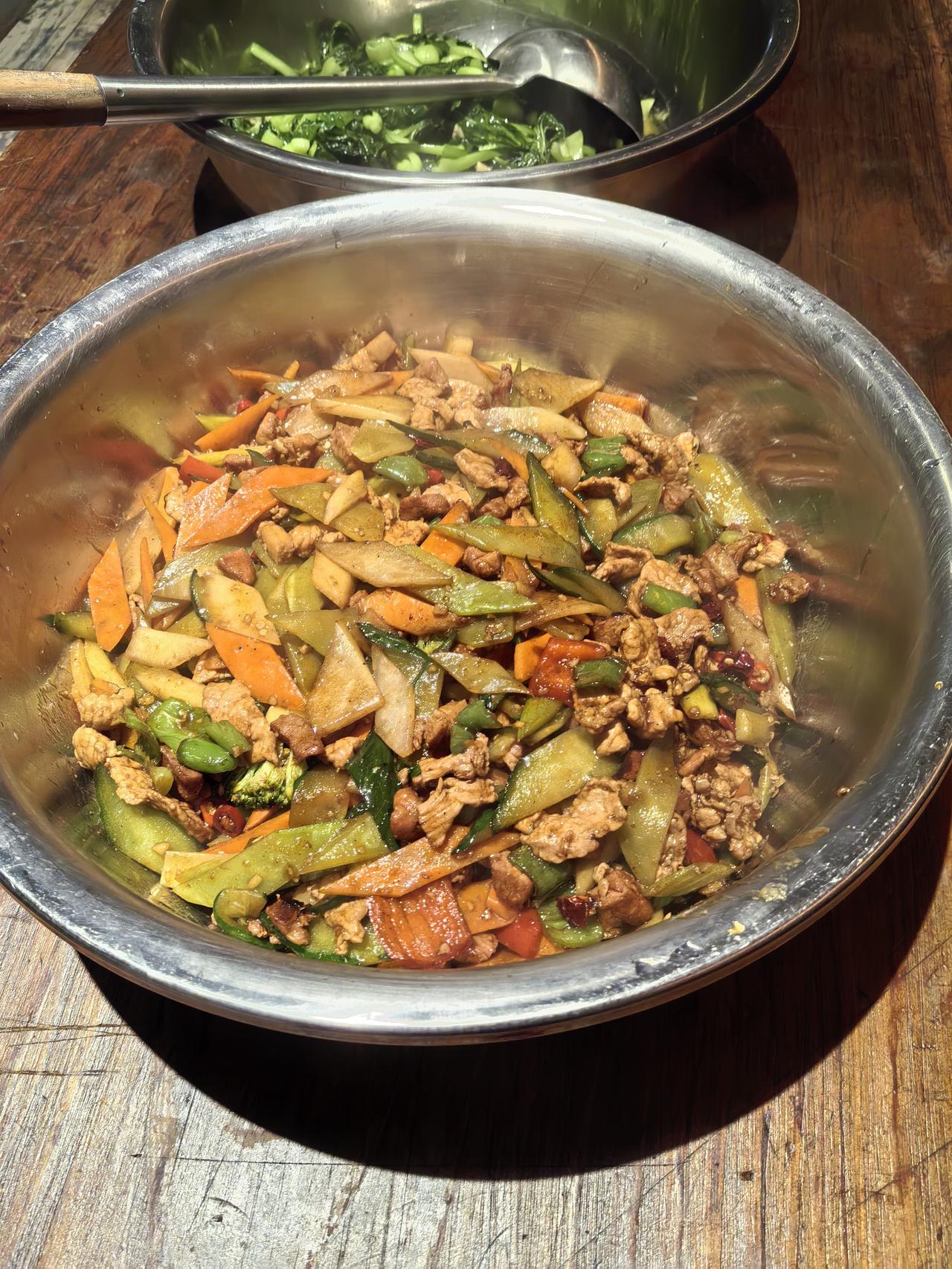 结束一天忙碌的后厨工作,脱下工装,我最期待的就是为自己做一顿简单却用心的晚餐。今天分享的这桌家常美味,每一道都藏着我的烹饪心得。 荤素搭配的大杂烩是今晚的主角。杏鲍菇的Q弹、黄瓜的清爽与肉片的鲜嫩在锅中碰撞,简单调味便鲜香四溢。旁边的清炒小白菜只用蒜蓉和少许盐提味,最大程度保留了蔬菜的清甜脆嫩。 山药炒肉片则是我私心推荐的养生组合。山药软糯、肉片滑嫩,入口温润滋补,特别适合劳累一天后来上一盘。最后,一碗热气腾腾的紫菜蛋汤下肚,暖胃又暖心。 作为厨师,习惯了为食客精心雕琢,但自己的晚餐反而更偏爱这种家常滋味。简单的食材,用心的烹饪,就是最治愈的人间烟火