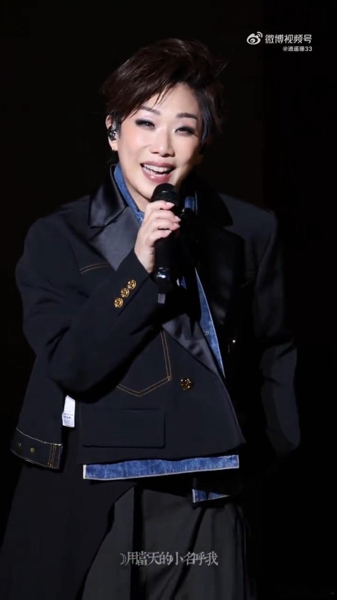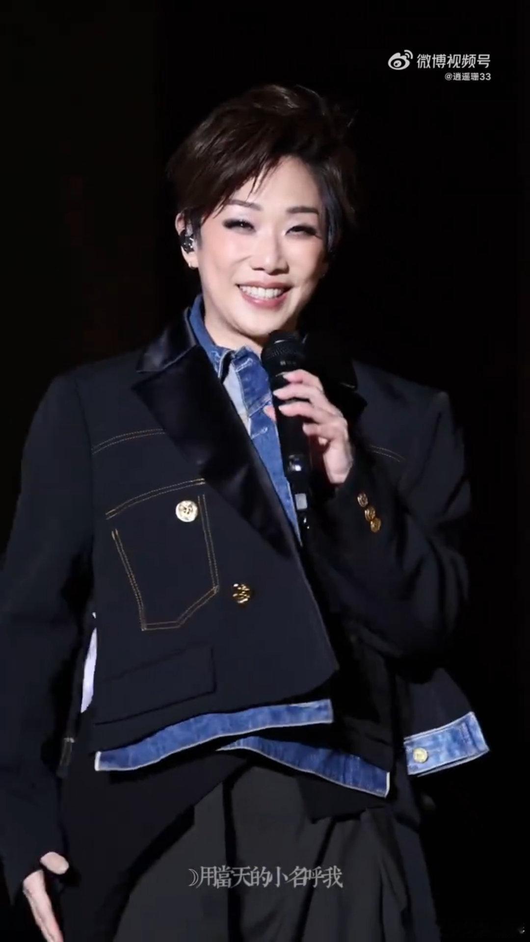 林忆莲舞台上的可爱动作 看着她托着脸颊对观众微笑,就像看到一个沉浸在音乐里的小女孩,既纯真又灵动,让人忍不住跟着一起笑起来。