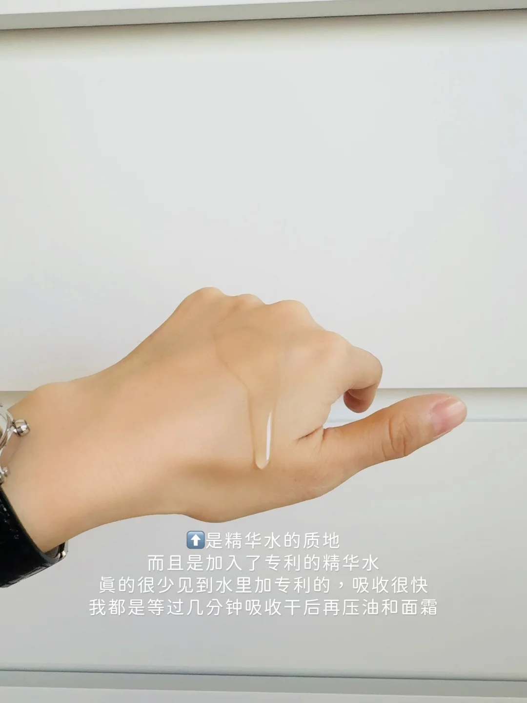 是精华水的质地,而且是加入了专利的精华水,真的很少见到水里加专利的,肤感很像lamer精萃水,适合秋冬,洁面后第一步先用,先让皮肤水润,虽然是精华水但不粘腻,吸收很快,我都是等过几分钟吸收干后再压油和面霜。