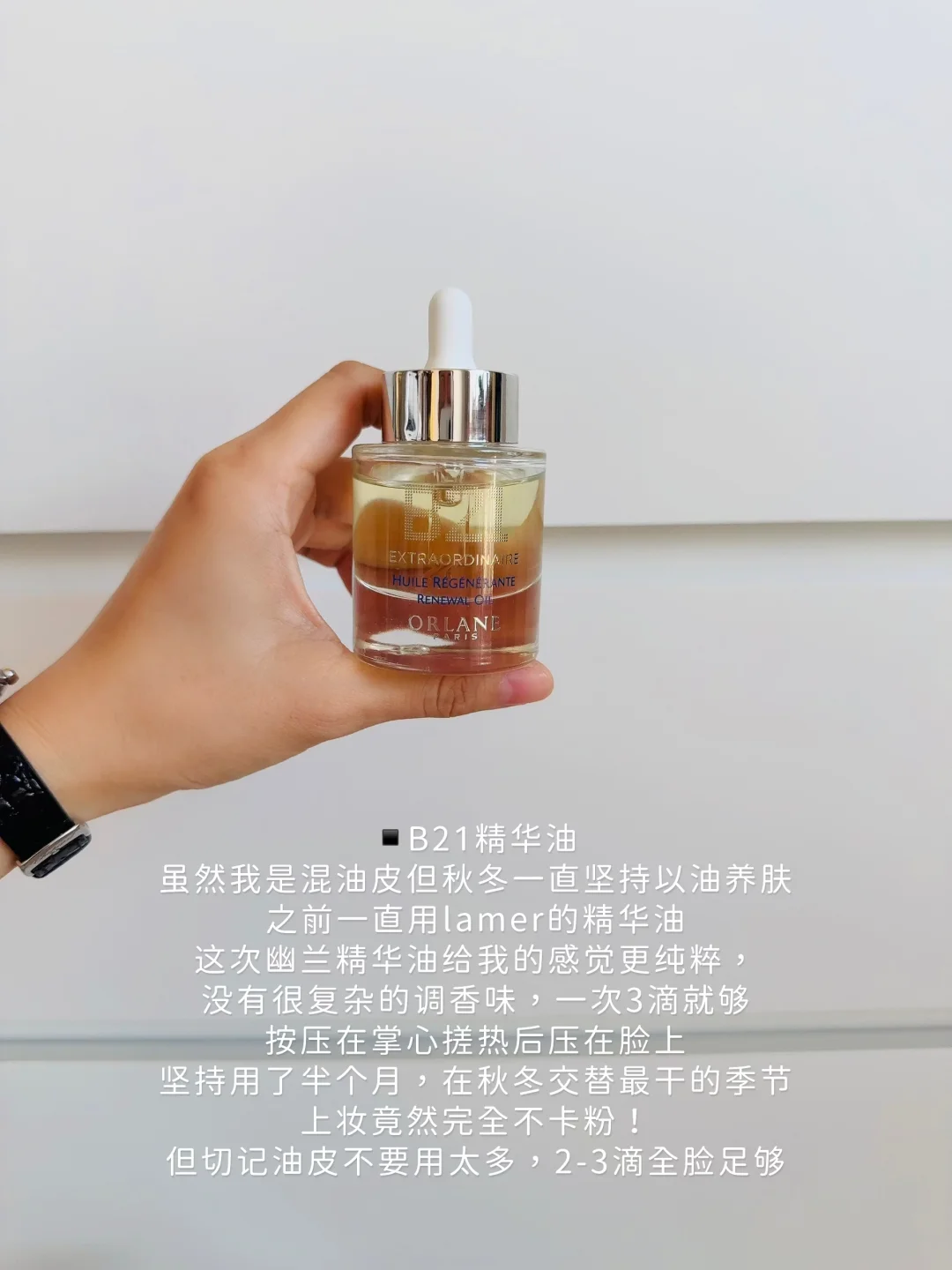 除了面霜之外这个精华油惊艳到我,虽然我是混油皮但一直坚持以油养肤,尤其是秋冬。选对精华油很重要,之前一直用lamer的精华油,这次幽兰精华油给我的感觉更纯粹,没有很复杂的调香味,一次3滴就够,按压在掌心搓热后压在脸上,然后再压面霜油封层锁住营养,我坚持用了半个月,在这这秋冬交替最干的季节皮肤每天都很润,上妆竟然完全不卡粉!这个精华油用来急救也特别合适。但切记油皮不要用太多,2-3滴全脸足够。