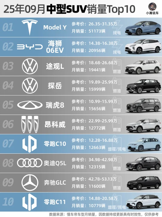🌟中型SUV:ModelY狂卖5万辆稳居中型SUV榜首。比亚迪海狮06EV月销突破2万升至第2位。零跑C11销量破万重回前十。