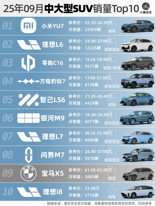 🌟中大型SUV:小米YU7月销破2万继续断层ling先。方程豹钛7首月月销破8千,你觉得它下个月销量能过万吗?改款的智己LS6和银河M9均表现出色,实现月销破6千!