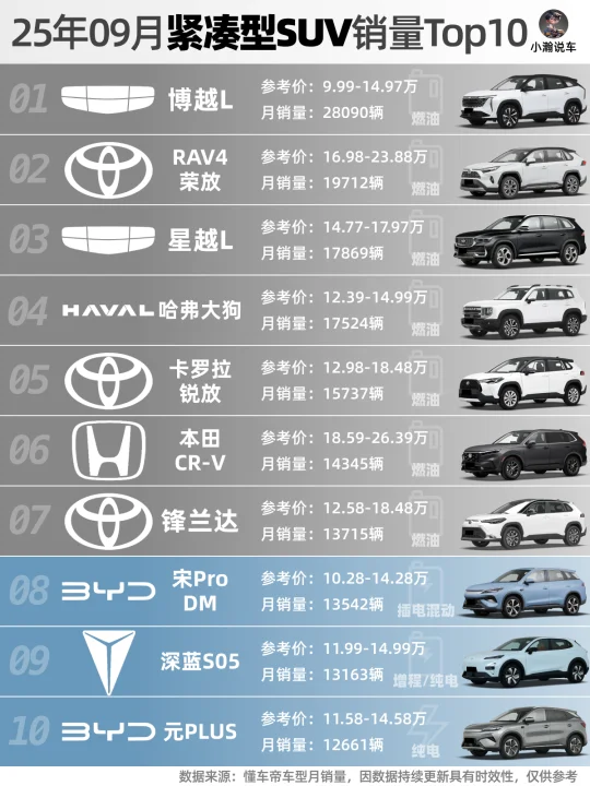 🌟紧凑型SUV:博越L月销接近3万保持ling先。哈弗大狗升至第4位。比亚迪宋Pro和元Plus上榜,深蓝S05冲进前10!