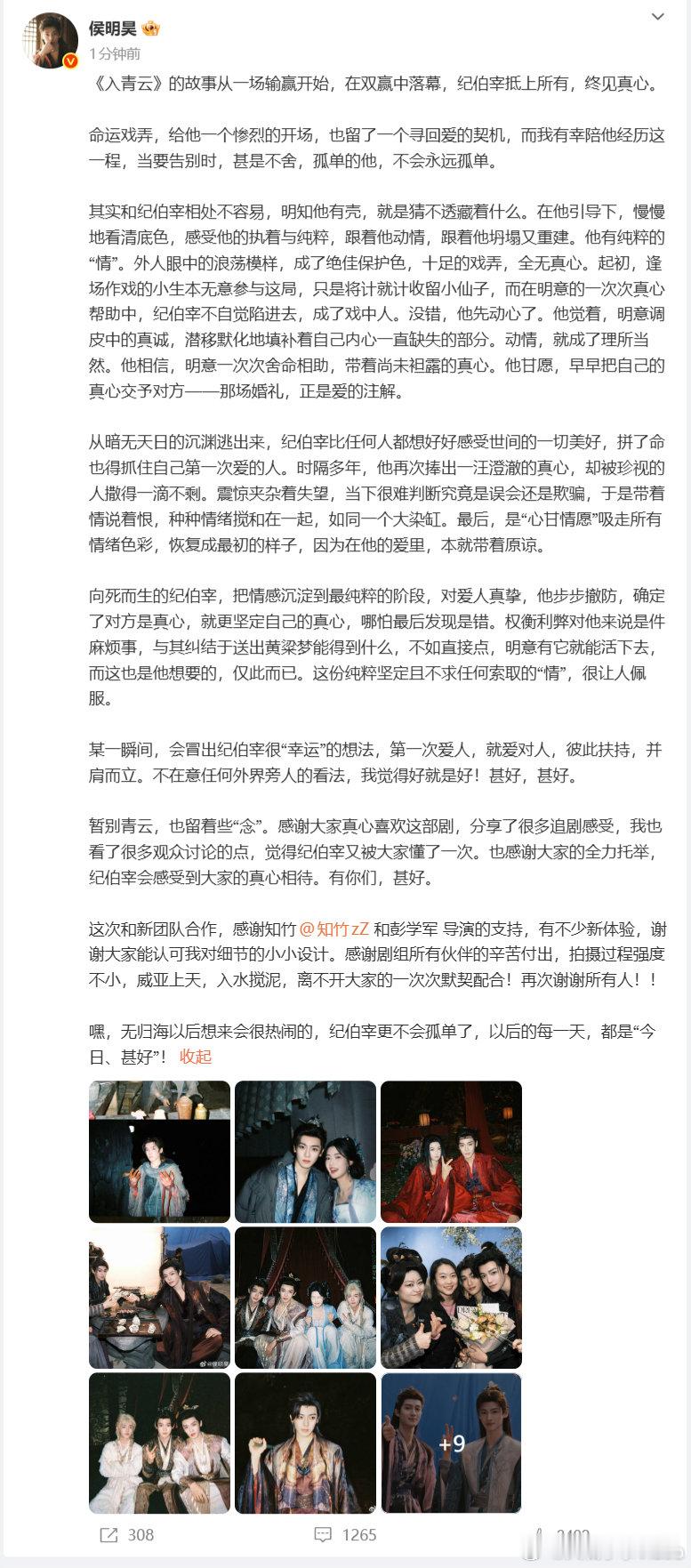 暂别青云,也留着些‘念’。感谢大家真心喜欢这部剧,分享了很多追剧感受,我也看了很多观众讨论的点,觉得纪伯宰又被大家懂了一次。也感谢大家的全力托举,纪伯宰会感受到大家的真心相待。有你们,甚好。
