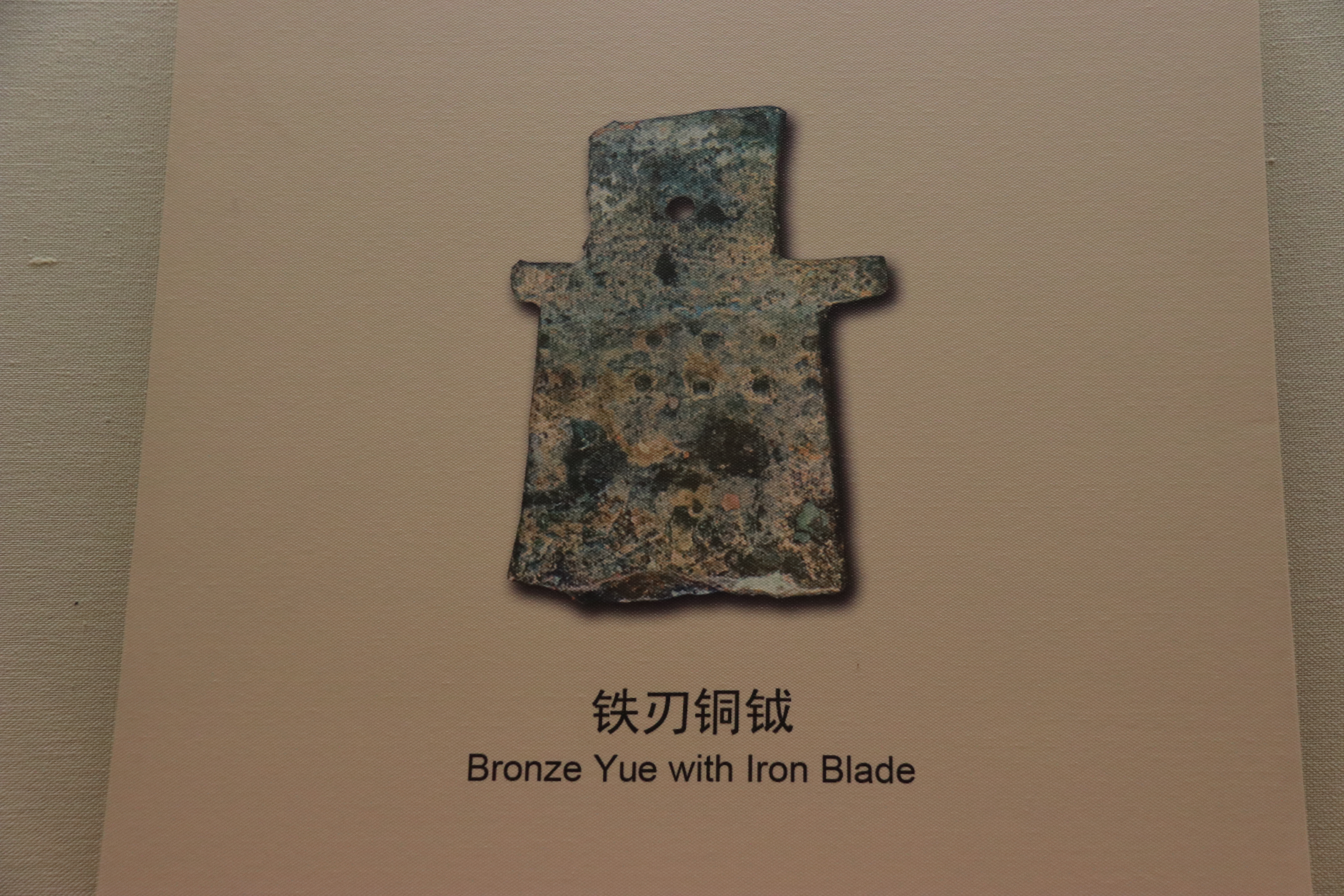 1972年河北藁城台西村商代遗址出土,残长11.1厘米,阑宽8.5厘米。铜身铁刃,铁刃部分残失,残存部分后段嵌入青铜器身内部约1厘米。铁刃铜钺是在铸造过程中将铁刃包嵌于青铜器身中。两种金属的浇铸包嵌技术的出现是中国古代冶金史上的一大进步。