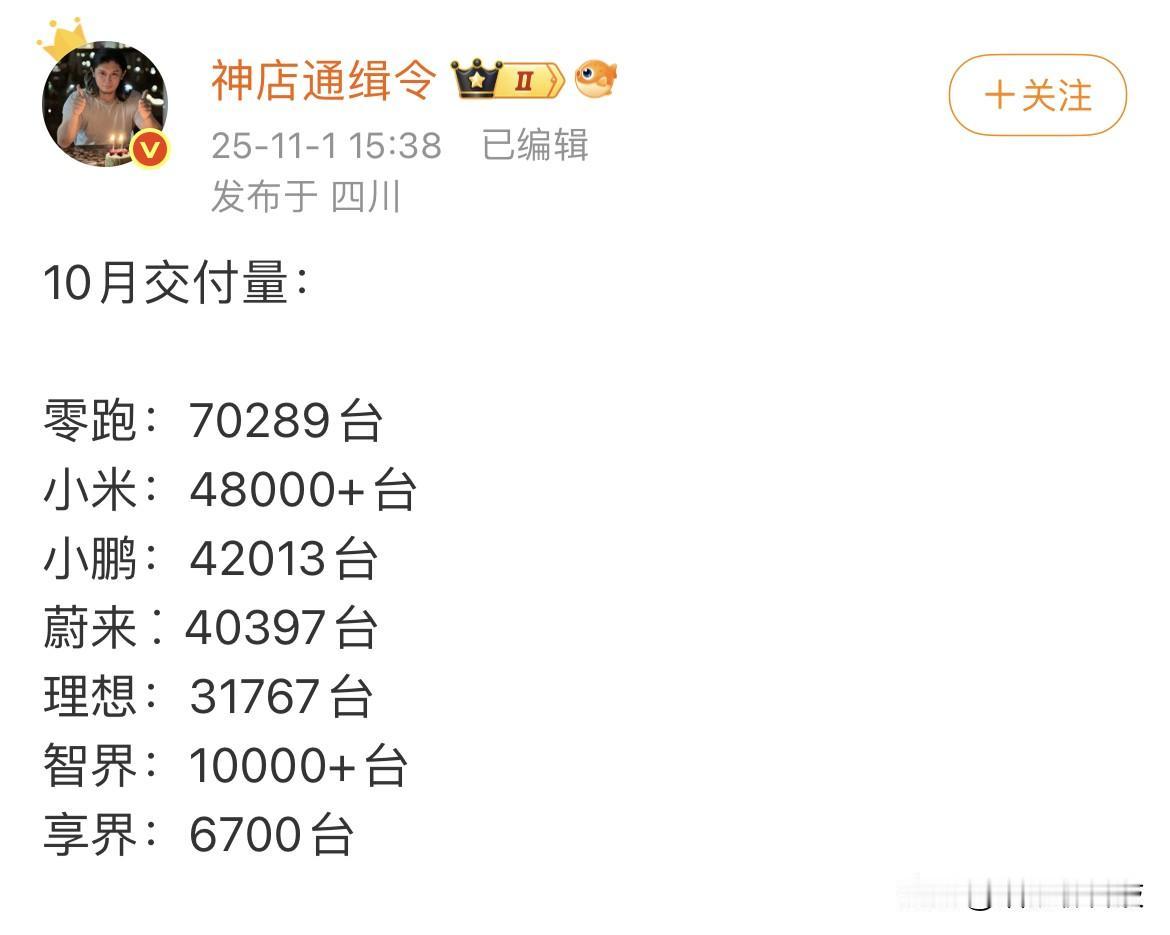 小米汽车销量是要彻底藏不住了!友商又要有动作了吧[笑哭]。 虽然小米对于 10 月的销量还是只公布了一个 4 万的整数,但在友商的衬托下依旧相当亮眼。 然而更恐怖的是其实销量已经非常接近 5 万,这次主要还是因为阅月度统计跨周了… 毫无意外11 月的销量必定破 5 万,而且随着交付速度的提升,锁单量也势必再次上涨。 所以友商要有新动作也是毫不意外~