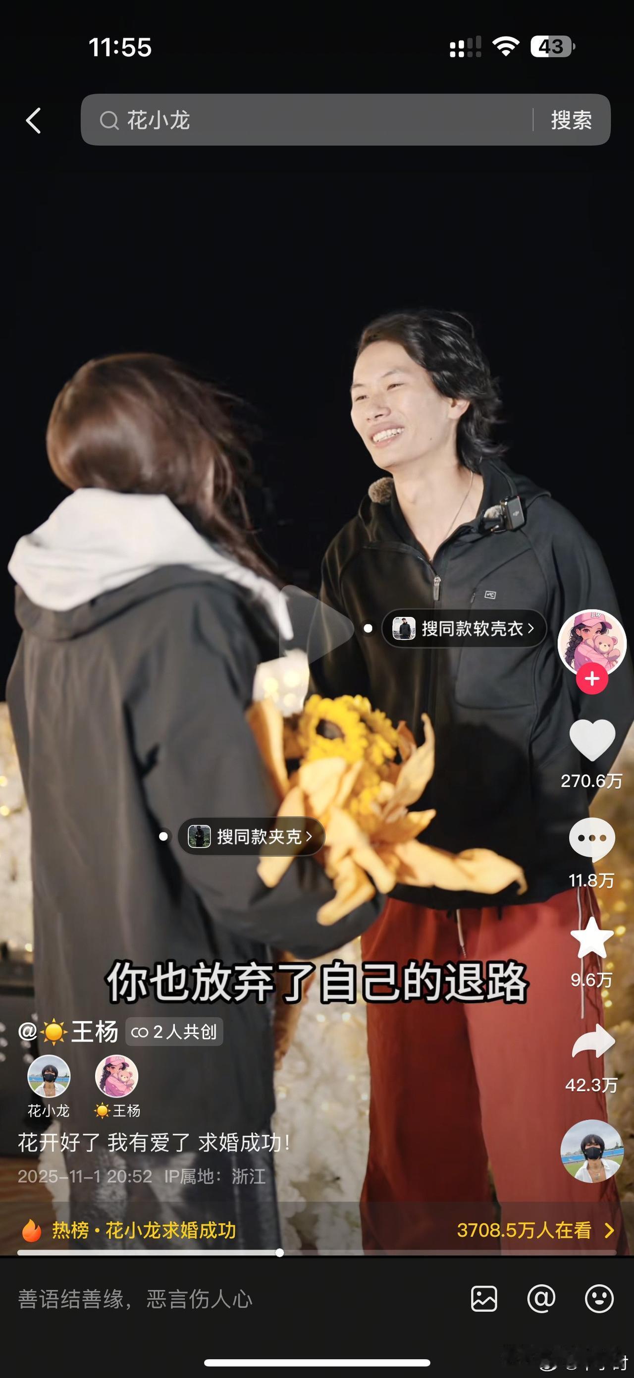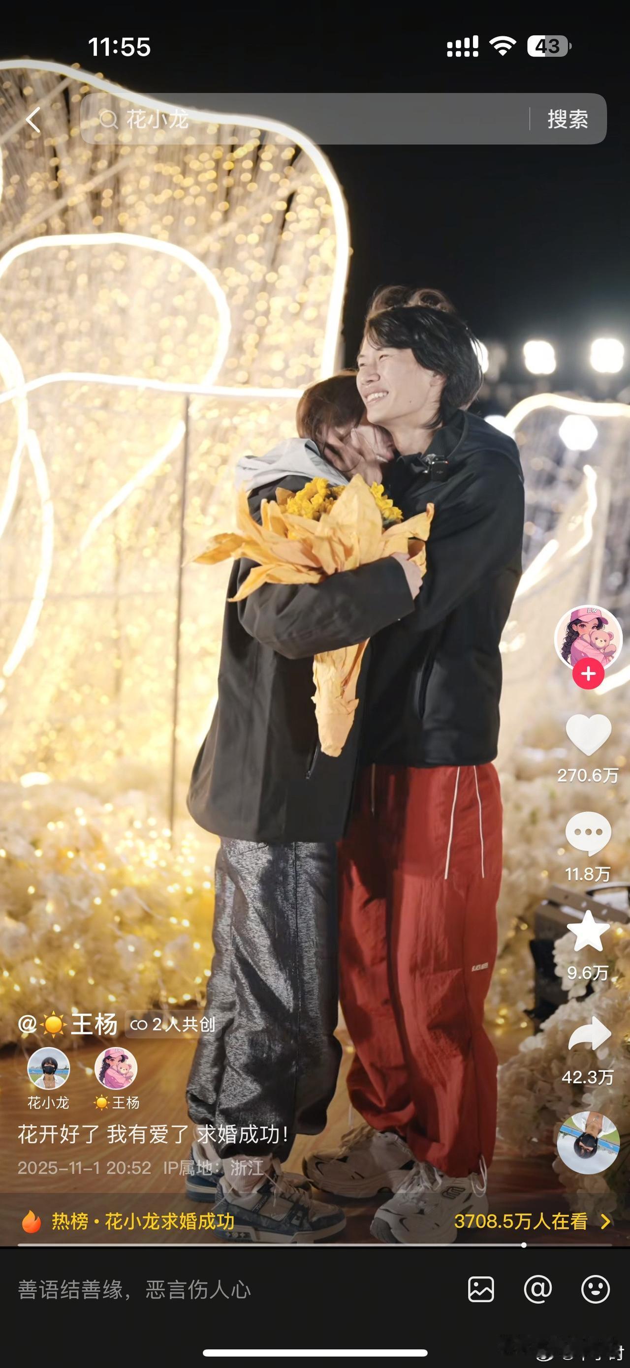 花小龙跟王杨求婚了。用无人机送花到武功山顶,非扯着王扬夜爬,冷飕飕的时候花灯亮起,王杨又哭了,戴上戒指后看了一眼,“呀好大……” 他们相遇之前,童锦程说,花小龙他只能废我7天,我带他玩一晚上,我能废他一辈子。看似玩笑,但这一辈子不让你输的承诺已经给出来了。 这对男人来说也是很重要,王老师最妙的一点,私下是很乖很可爱的女生。跟视频里的冷艳和御姐不太一样。想尽办法离开杭州,跟男生回到重庆,爱上运动,跟着一起直播。如果没有这个改变,这份爱情无法一直这样轰轰烈烈。很美好的感情,让依然想要相信爱情的人刷着手机躲在被窝里流泪。真情催生人间值得的催产素。