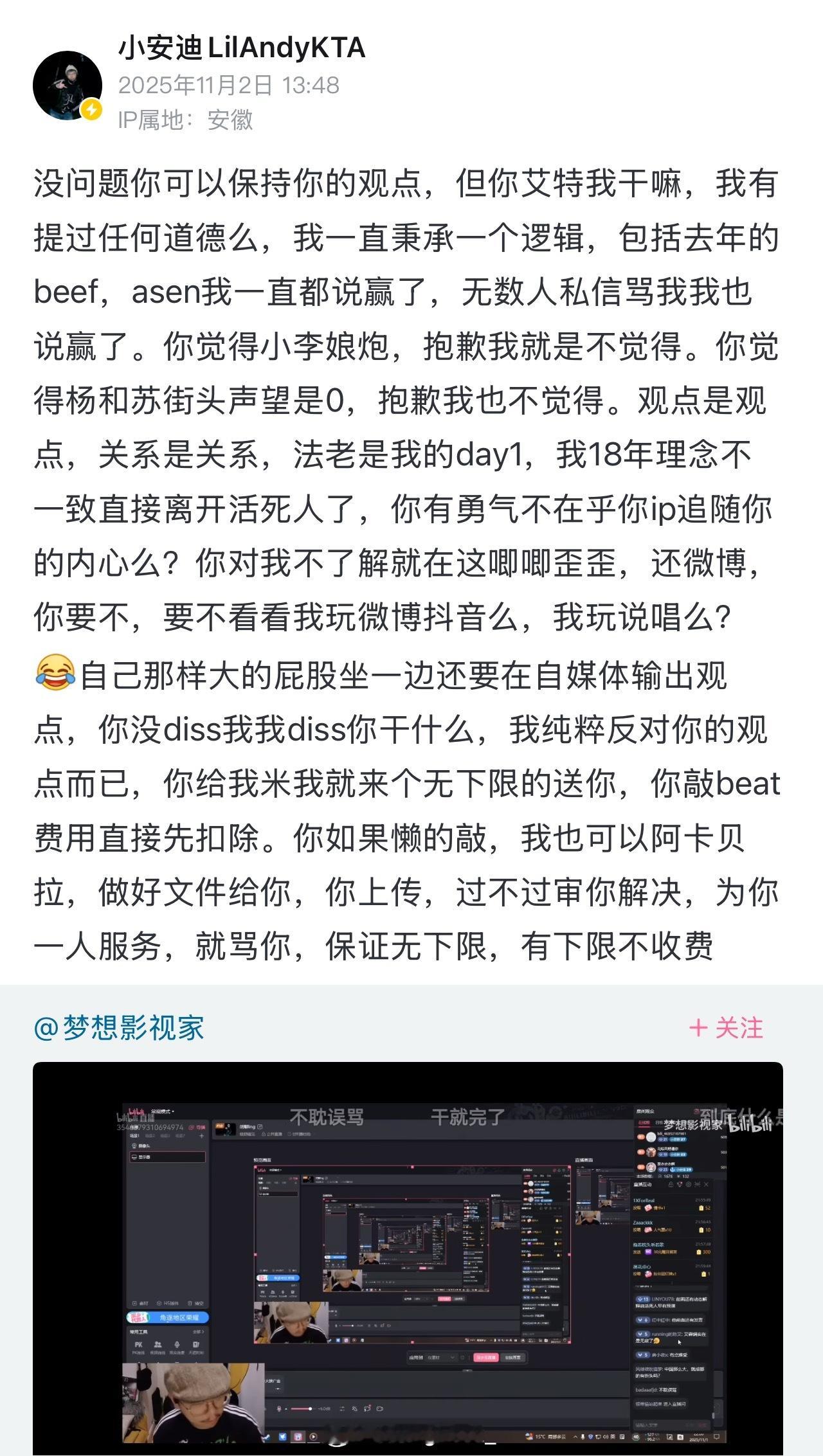 “我一直秉承一个逻辑,包括去年的 beef,Asen我一直都说赢了,无数人私信骂我我也说赢了。你觉得小李娘炮,抱歉我就是不觉得。你觉得杨和苏街头声望是0,抱歉我也不觉得。法老是我的day1,我18年理念不一致直接离开活死人了,你没diss我我diss你干什么,我纯粹反对你的观点。”