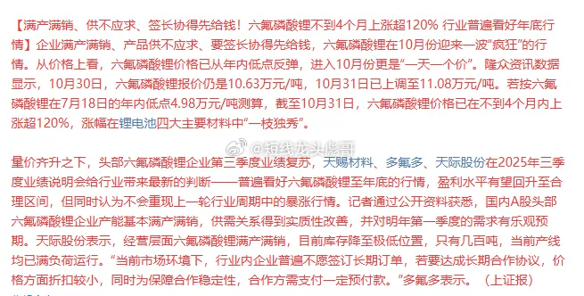 满产满销,供不应求,签长协还得先付款!六氟磷酸锂价格在不到四个月的时间里飙涨超120%,行业普遍看好其年底行情。