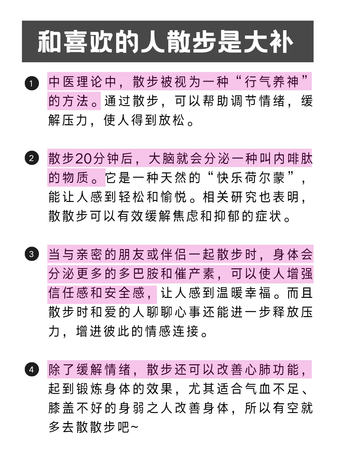 当与亲密的朋友或伴侣一起散步时,身体会分泌更多的多巴胺和催产素,可以使人增强信任感和安全感,让人感到温暖幸福。而且散步时和爱的人聊聊心事还能进一步释放压力,增进彼此的情感连接。