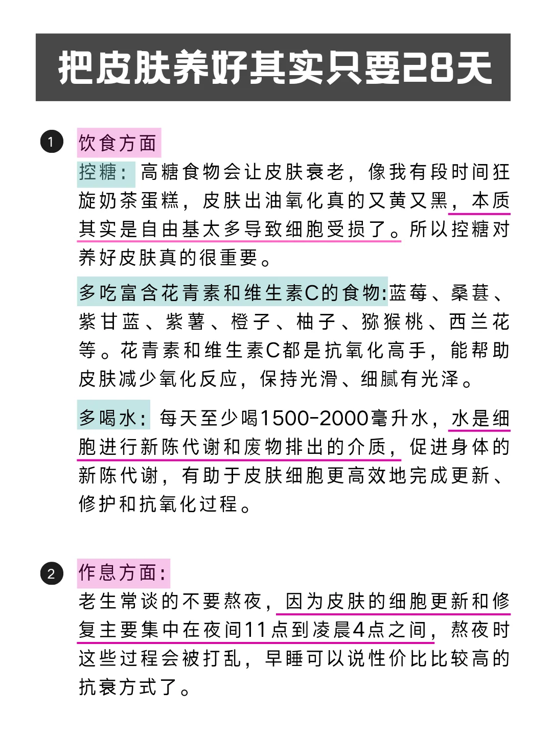 多喝水:每天至少喝1500-2000毫升水,水是细胞进行新陈代谢和废物排出的介质,促进身体的新陈代谢,有助于皮肤细胞更高效地完成更新、修护和抗氧化过程