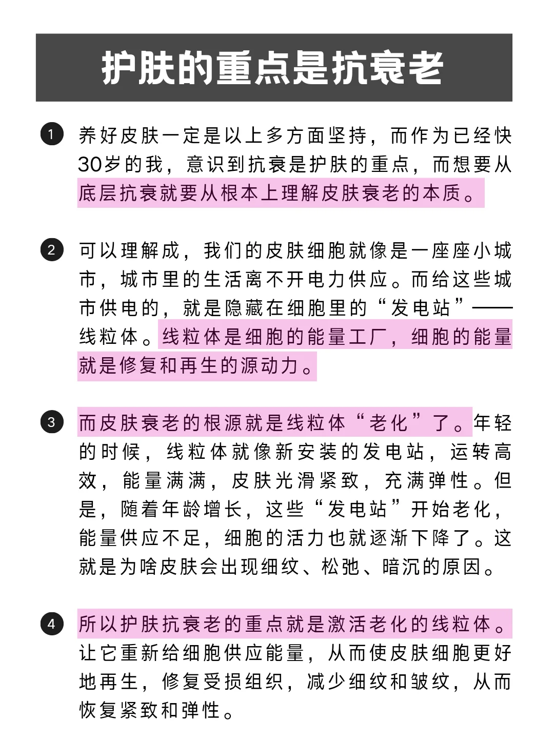 你可以理解成线粒体在细胞里就像一个城市里的发电站⚡️,它能把营养物质转化成细胞能用的能量(ATP)。细胞的每一个活动,不管是修复受损的组织,还是合成新的蛋白质,都需要能量⚡️。激活老化的线粒体,就能重新给细胞供应能量,从而使皮肤细胞更好地再生,修复受损组织,淡化细纹和皱纹,恢复紧致和弹性。