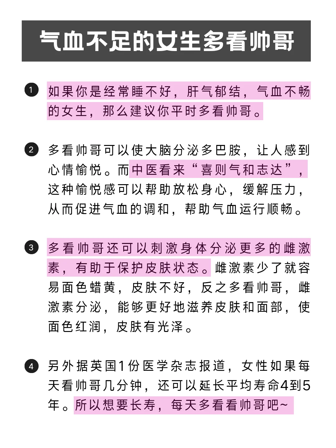 多看帅哥可以使大脑分泌多巴胺,让人感到心情愉悦。而中医看来“喜则气和志达”,这种愉悦感可以帮助放松身心,缓解压力,从而促进气血的调和,帮助气血运行顺畅。