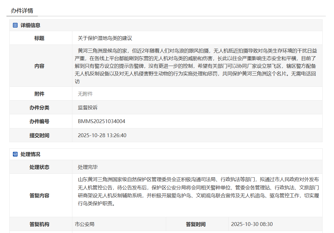 #当地回应网友称无人机扰鸟#【网友反映东营黄河三角洲“无人机扰鸟”,当地回复称正积极沟通,拟发布无人机管控公告】#网友反映黄河三角洲无人机扰鸟# 眼下正值山东省东营市观鸟季,成千上万的候鸟在黄河三角洲自然保护区翩跹起舞,场面震撼。但有网友爆料称,因部分摄影爱好者为追求极致视角,出现了“不和谐”行为:使用多架无人机在鸟群中穿梭、追拍……导致有鸟类受惊或受伤。