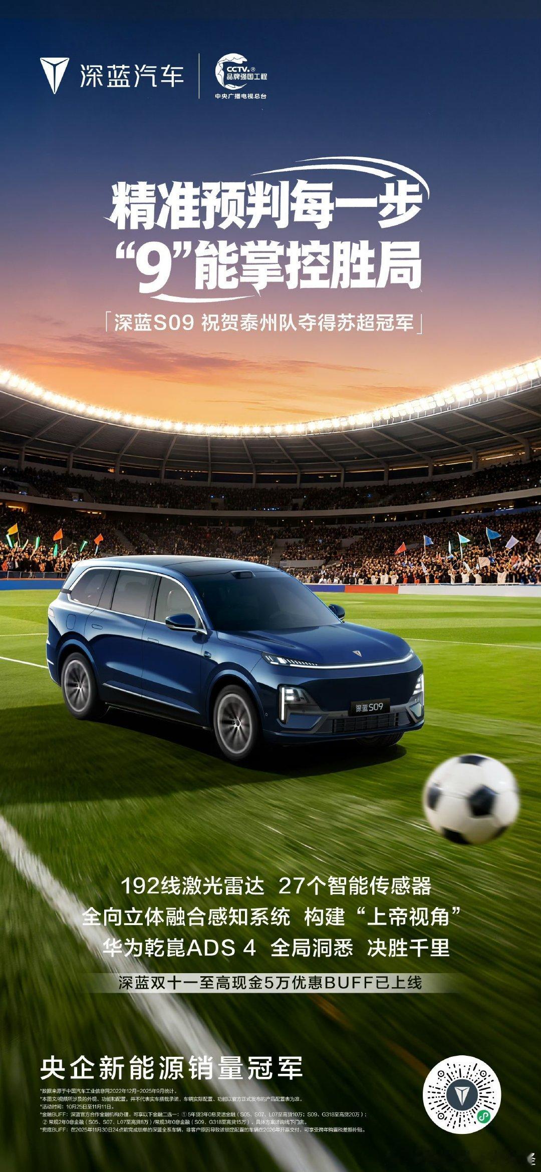深蓝不愧是最会押宝的品牌。苏超赞助泰州队,没想到泰州一路逆袭到了决赛,在决赛火力全开,关键时刻的进攻防守,演绎了什么叫赛事的惊心动魄!泰州队最终成功夺冠,全场声浪仿佛隔着屏幕震撼到了每个人!观赛现场气氛热烈,在深蓝S09里看球也是氛围感十足!后排21.4英寸3K后排娱乐屏搭配智慧沉浸全景声,直接把沉浸感拉满,不愧是鸿蒙座舱HarmonySpace 5!更贴心的是,将座椅调整至超豪华旗舰四座模式,一边观赛一边躺平简直是移动的豪华影音厅。已经在查最近还有什么别的比赛了,真的很需要在深蓝S09里再看一场!