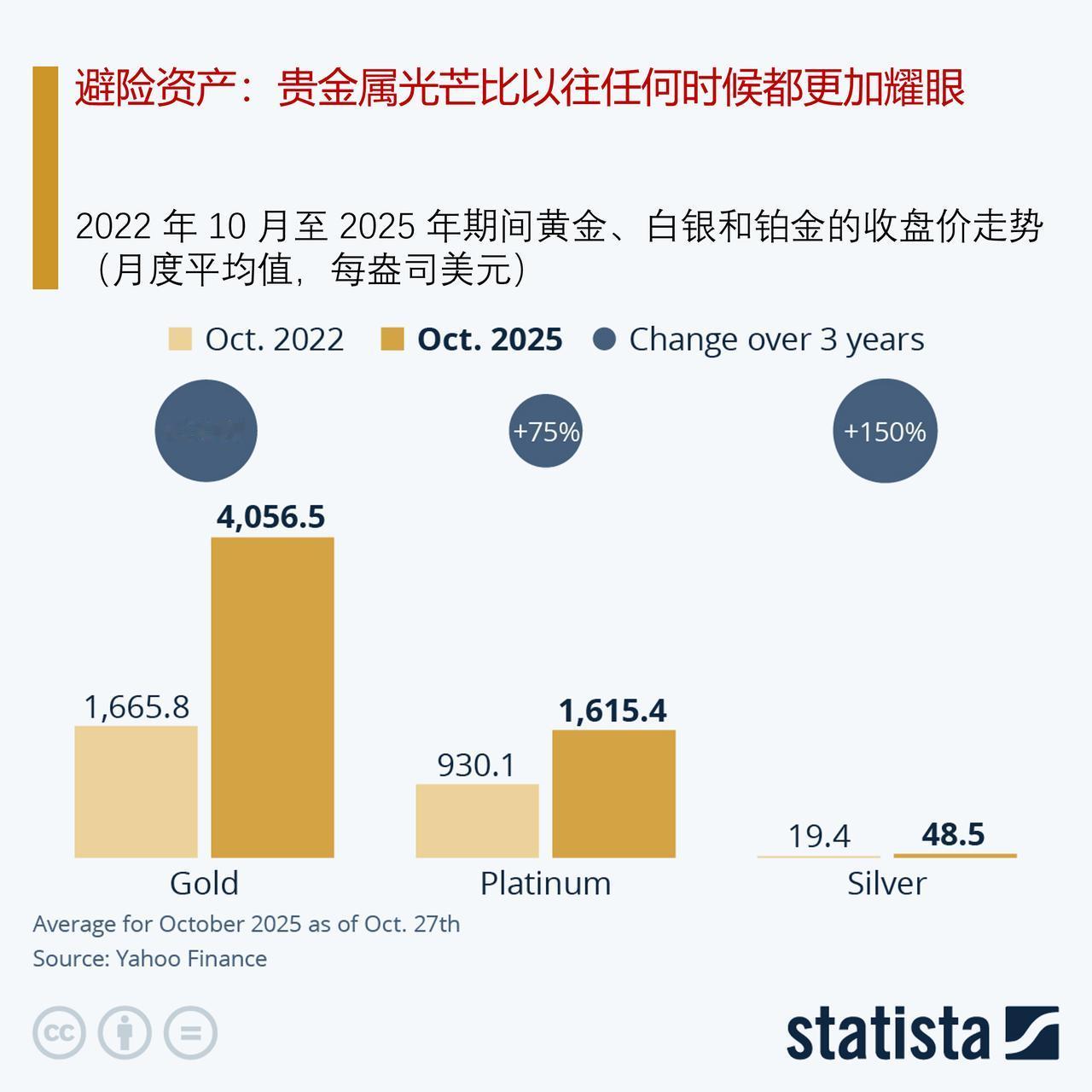避险资产:贵金属光芒比以往任何时候都更加耀眼 诸如黄金、白银或铂金这类贵金属近期再次证明了其作为避险资产的地位,其价格走势反映了全球经济的不确定性、地缘政治的紧张局势以及货币政策的不断变化。 在所有投资品种中,黄金最为受欢迎。其价格经历了显著的上涨,达到了前所未有的高位。在 2025 年 10 月期间,黄金价格平均飙升至每盎司超过 4000 美元(1 盎司等于 28 克,相当于一枚大硬币的重量),创下了历史性的里程碑,并且自 2022 年 10 月以来上涨了 144%。此次上涨是由持续的地缘政治不稳定因素推动的,比如正在进行的俄罗斯与乌克兰冲突以及美国与中国的贸易紧张局势。 银的价格走势也颇为相似:从 2022 年 10 月平均约每盎司 19 美元,到三年后涨至每盎司超过 48 美元,涨幅达 150%。这一上涨既得益于其避险资产的地位,也反映了银在工业领域的需求不断增长,尤其是在太阳能电池板和电动汽车等技术领域。同时,供应短缺和投机性需求进一步加剧了价格波动。 铂金虽然不如黄金或白银那样引人注目,但其价格近期也出现了显著的上涨。这种上涨主要是由供应短缺(对像俄罗斯这样的主要生产商实施制裁)以及工业需求(尤其是在汽车领域)所推动的。从 2022 年 10 月每盎司略高于 900 美元的价格,到 2025 年 10 月每盎司约 1600 美元,三年间价格上涨了 75%。