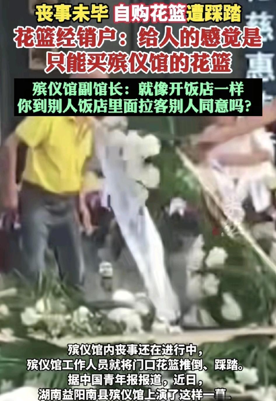 湖南益阳一家殡仪馆,有工作人员在门口踩踏家属的花篮,当时家属还没有回去,人还在那里跪着,就这样践踏花篮。花店的工作人员称,看着就像人,如果不从殡仪馆买花的话,就会这样被对待。殡仪馆工作人员回应,这就像去饭店抢别人家的客人一样,别人根本不会同意。很多网友觉得殡仪馆这样的处理方式令人心寒,也是对逝者非常不尊重的,殡仪馆本身就是送死人最后一程的地方,相反把利益摆在第一位。