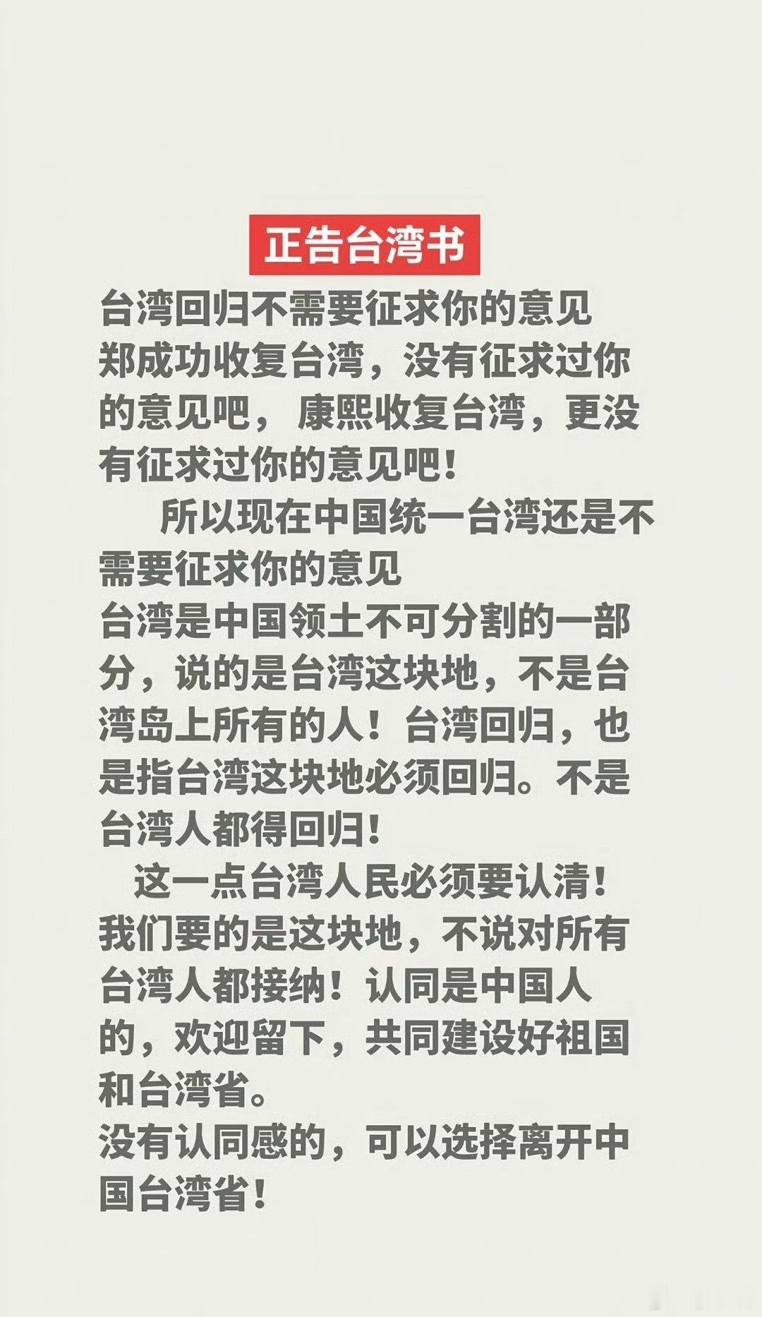 台湾人面临的三种选择请所有台湾同胞都好好看看这份《正告台湾书》(民间版),虽然不是官方发布的,但代表全体中国人的心声。台湾回归指的是台湾这块地,而不是所有台湾人。认同自己是中国人,欢迎留下,不认同自己是中国人,可以选择离开中国台湾省!热点观点 ​​​