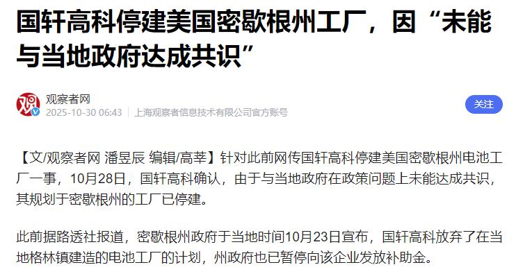 中企决定放弃在美国建造工厂,保命比赚钱重要,密歇根24亿美元打水漂!近期,密歇根州表示:中国电池企业国轩高科决定放弃在当地投资24亿美元的电池工厂计划。 这片原本要建成动力电池生产基地的土地,现在依然安静地躺在那里,而背后的故事,折射出当前中国企业出海面临的复杂局面。 时间回到2022年,当时国轩高科与密歇根州政府的合作可谓“蜜月期”,这个规划占地广阔的项目堪称双向奔赴的典范,根据密歇根州经济发展局(MEDC)当时的公告,国轩高科计划投入23.64亿美元(约合167.8亿元人民币),建设涵盖正负极材料与电芯的一体化基地,规划年产超40GWh电池,还承诺创造2350个高薪岗位,平均时薪达29.42美元。 对于曾因汽车工业辉煌又陷入衰落的密歇根州来说,这项目被寄予了“经济救赎”的厚望,州长格雷琴·惠特默当时高调宣称要成为电动汽车和移动公司的卓越目的地,州政府更是爽快抛出1.75亿美元税收激励和补助金的橄榄枝,再加上联邦《通胀削减法案》(IRA)提供的每千瓦时最高45美元税收抵免,这笔账在当时怎么算都透着赚头。 国轩高科当时也满心期待借着这股东风切入美国市场,甚至特意让美国子公司管理层以美籍人士为主,承诺从美国供应商采购大部分材料设备,力求融入当地供应链。 然而,这场看似完美的联姻,热闹劲儿只持续了几个月就急转直下,最先发难的是项目选址所在的绿镇居民,起初大家只是质疑工厂会破坏湿地和农田,担心环保风险与税收负担,但这些合理诉求很快被更尖锐的声音带偏,所谓“外来影响”的说法毫无证据却在地方舆论中迅速发酵。 2023年4月,数百名抗议者聚集在附近的大急流城,连部分州代表也加入了反对行列,到了9月更是上演戏剧性一幕——支持项目的绿镇政府委员会被居民投票罢免,新上任的官员一上来就更换政府大楼门锁,直接取消了此前批准的土地使用许可,国轩高科试图通过行政诉讼挽回局面,却因地方政府拒绝配合陷入停滞,项目现场很快陷入停工状态。 更让项目雪上加霜的是政策层面的变数,2023年后,美国财政部陆续出台IRA细则,明确“受关注外国实体”若被外国政府控制25%以上,将无法享受补贴,这一规则直接击中了项目的财务逻辑,而国会层面的压力更是步步紧逼,有议员专门推出《NO GOTION法案》,明确阻止国轩高科获取IRA税收抵免,还敦促外国投资委员会展开调查,即便国轩高科有大众汽车作为第一大股东,管理层也以美籍人士为主,却依然没能躲过这场针对性的审查浪潮。 与此同时,美国电动车市场也传来坏消息,2024年4月电动车注册量同比下滑4.4%,创下近十年首次负增长,各大车企纷纷缩减电池订单,投资者对大规模制造项目的信心持续下降,密歇根州过去两年宣布的新能源项目中,约三分之一都已延期或暂停,内有地方民意反转,外有政策与市场双重降温,国轩高科的密歇根项目彻底陷入两难。 2025年10月,密歇根州经济发展局正式发出违约通知,认定国轩高科未能完成投资与建设里程碑,不仅要追讨此前拨付的2360万美元土地收购费用,还取消了1.75亿美元的税收激励和补助金,这场历时三年的投资计划最终宣告失败。 同期福特位于密歇根的磷酸铁锂电池工厂因补贴政策变数削减800个岗位,通用汽车也放弃了当地一座电池厂,远景动力、Group14等企业的项目同样因政策变动、设备受限陷入停滞。就连宁德时代与福特的合作项目,也因政治阻力从35亿美元投资缩减至20亿美元,产能规划同步下调。 这些案例共同指向一个现实,如今的美国市场,早已不是把厂盖起来就能挣钱的乐园,政策摇摆不定、贸易壁垒高企、民意容易被政治情绪裹挟,再加上行业本身进入回调周期,中企出海面临的已不是单纯的商业竞争,而是多重风险交织的复杂局面。 说到底,国轩高科放弃密歇根工厂,哪里是什么“退缩”,分明是算清了利弊后的明智之举,24亿美元的投资不是小数目,与其在无休止的审批纠缠、政策变脸和民意摇摆中消耗,不如及时抽身保全实力。 毕竟,国际化的本质是追求更广阔的发展空间,而不是明知山有虎偏向虎山行的蛮干,在复杂多变的全球市场中,懂得“保命 的智慧,才能在长远的竞争中真正赚到钱,这或许就是国轩高科给所有出海中企最实在的启示。