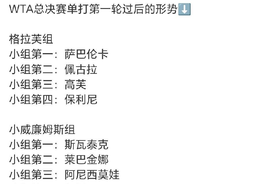 WTA总决赛单打第一轮成绩出炉! 格拉芙组,排在前两名的是萨巴伦卡和佩古拉。 小威组排在前两名的是斯瓦泰克和莱巴金娜。 四个美国人,有三个已经落了下风。 按照赛事规定,这次竞技,要先比胜场数,再比胜盘率,最后比胜局率。 还记得去年的斯瓦泰克吗?去年输了一场直接小组出局,连她本人自己都没想到…… 所以,就算是输,也得多保一局是一局。 以现在的状态,大家觉得这次谁最有可能在小组出线呢? #新锐创作者成长计划#