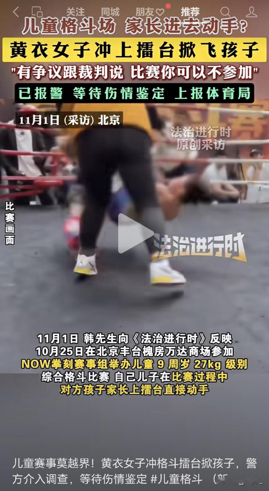 儿童格斗赛秒变家长全武行!北京一妈妈冲上擂台掀翻儿子对手!网友:受不了,干嘛让孩子学? 11月2日,北京石景山万达广场,这里正在举办“NOW拳刻”儿童9周岁27kg级别综合格斗比赛。 黑衣少年和蓝裤少年对决中,黑衣少年对蓝裤少年发起了压制性的攻击,蓝裤少年想反击但没有成功。 突然,蓝裤少年的妈妈跑上了擂台,一把把黑衣少年给掀飞了。 随后,9周岁的少年擂台变成了双方家长的混战,双方家长爆发肢体冲突。少年格斗比赛裁判,瞬间变身家长混战裁判。 黑衣少年的父亲韩先生指控对方家长干扰比赛结果,并称孩子赛后出现头晕症状,已报警处理。 评论区的网友们,对于蓝裤少年的妈妈纷纷谴责: “受不了,干嘛还让孩子学?” “她们家孩子打别人行,别人不能打她们家孩子。” “以后谁也不和他家孩子玩了!诶可怜!” “没这心理素质,就别让孩子从事这项运动呀!” “就这等人物,让孩子出门都多余。” “其实这么小骨骼肌肉还没长完全很容易受伤,真不建议这么早练格斗。” “裁判也有责任,为什么不拦着点儿?” “这是比赛呢,家长上去就不对了。” “综合格斗本来就不容易。” “要吃这碗饭,你就要有思想准备。” “练练玩,当做强身健体得了。” 但据评论区一条据称知道来龙去脉的评论讲,是蓝裤少年已经制服了在上身位的黑衣少年,但因为有争议,而且黑衣少年也没有拍地认输。 所以裁判就让两人恢复体位重来一遍,位于上身位的黑衣少年,仗着体位优势,直接用拳砸向蓝裤少年。 这才引起护子心切的妈妈,不顾一切的翻身上擂台,一把掀翻了困住儿子的黑衣少年。 事情的真相到底如何,只怕是公说公有理,婆说婆有理。 这场罗生门事件,还需要等待官方的进一步调查结果。不妨让子弹再飞一会。 信息来源于新晚报,侵联删! 带定位晒今日生活 我的今日状态:😁轻松愉快 我这里的天气:☀️晴天
