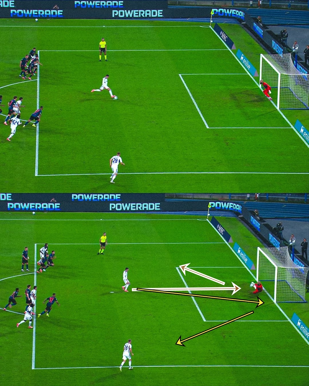 科莫在主罚点球时的战术安排,斯莫尔奇奇(28号)没有进入禁区却能最快拦截到米林科维奇向左扑出的球,如果莫拉塔的角度更刁钻,这个安排是不多见的。
