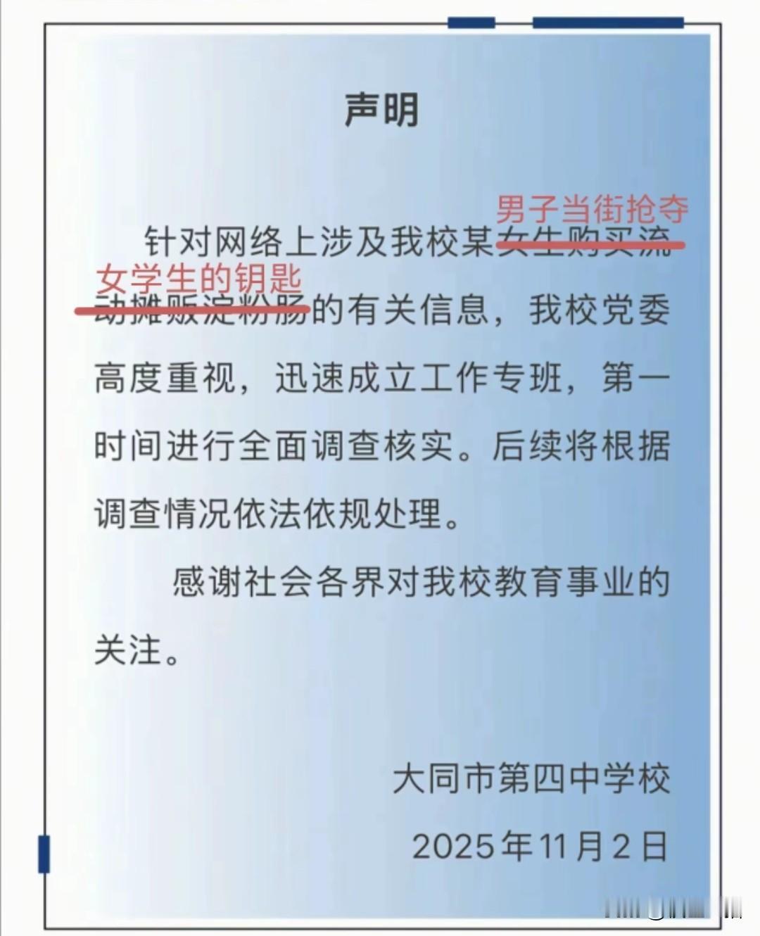 保安是让你保卫孩子们的安全的, 你说你挺大一老爷们儿,你这不欺负学生,吃个淀粉肠你都要管,还擅自抢女孩子的钥匙,那是人家的私人财产。 你小手一背往那一站,好大的威风,这个女孩放学了,嘴馋了,在校门口花自己的钱买了一根淀粉肠,也没有违反哪条校规,没吃你家大米了,还是花你的钱了。 你别让这些商贩在校门口摆摊,你朝个孩子耍什么能耐,你偏偏选择了抢走孩子的钥匙,让孩子哭着求你,还当着这么多同学家长的面,你考虑过孩子的自尊心吗? 你这个年纪也是当父亲的人,就这么点小事上纲上线的,学校也是第一时间发了声明,针对网络上涉及我校某女生购买流动摊贩淀粉肠的有关信息,女孩被保安抢钥匙的事倒是没有提。 而且你没有执法权,你这跟抢劫有什么区别,女生是放学在校外买吃的,学校都管不了这么宽吧。