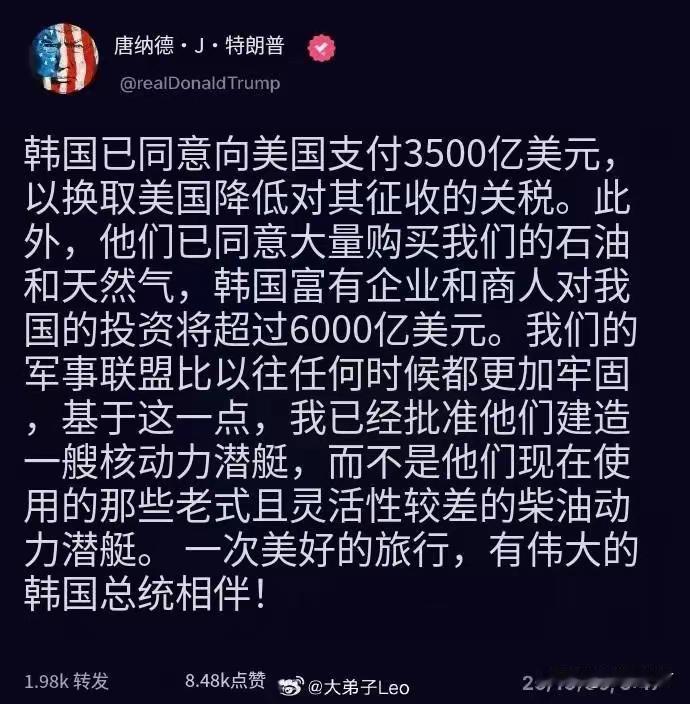 韩国也知道,特朗普批准韩国建造核动力潜艇,特朗普为韩国画的饼够大。 特朗普批准韩国建造核动力潜艇,前提是韩国有建造核潜艇的能力吗?韩国版的核动力潜艇能不能携带核导弹?这些韩国有吗? 如果美国说“我批准你韩国建造核动力潜艇,但是韩国你要独立自主,不能依靠外部援助建造。 韩国是不是最终空欢喜一场!3500亿美元花了,结果这核动力潜艇也是镜中月,水中花。 特朗普称,韩国已经同意向美国支付3500亿美元,以换取美国对韩国征收的关税。特朗普基于这一点,特朗普建造一艘核动力潜艇。
